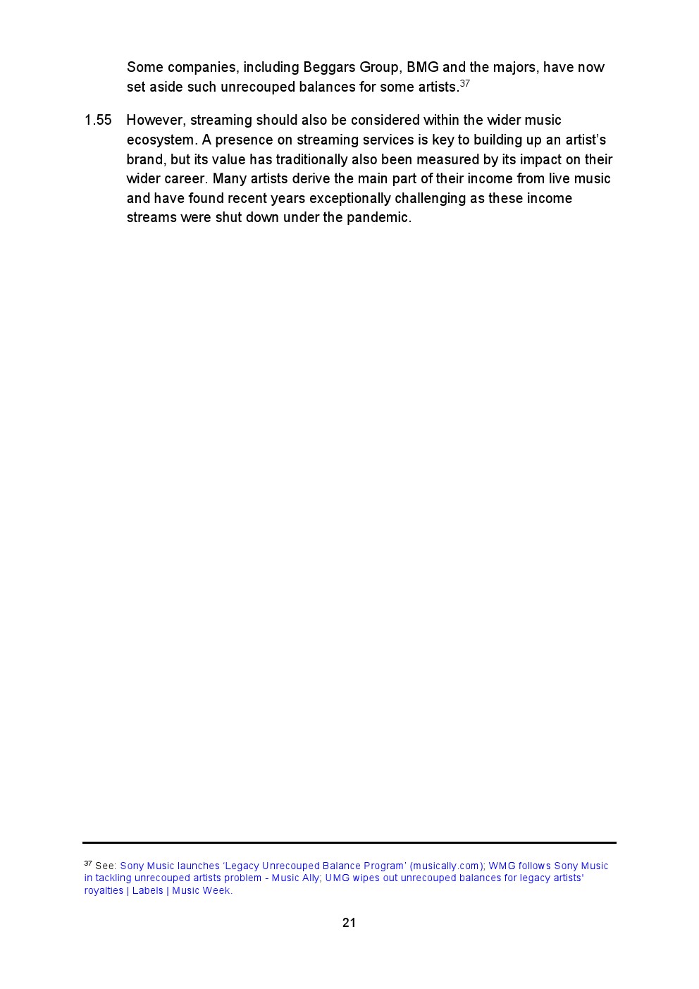但是,与许多其他行业一样,该行业也受到了冠状病毒大流行的沉重打击。尽管与 2020 年相比有所增加,但上述数字与 2019 年相比分别下降了 31% 和 15%。现场音乐尤其受到严重影响,损害了音乐创作者的利益,而音乐创作者此前曾以此为收入来源。艺术家更加依赖其他收入,包括来自流媒体的收入。