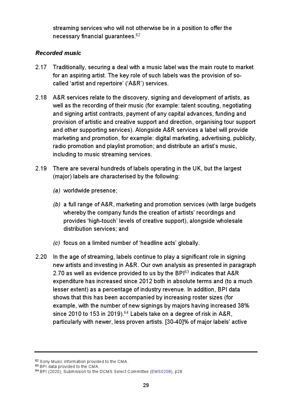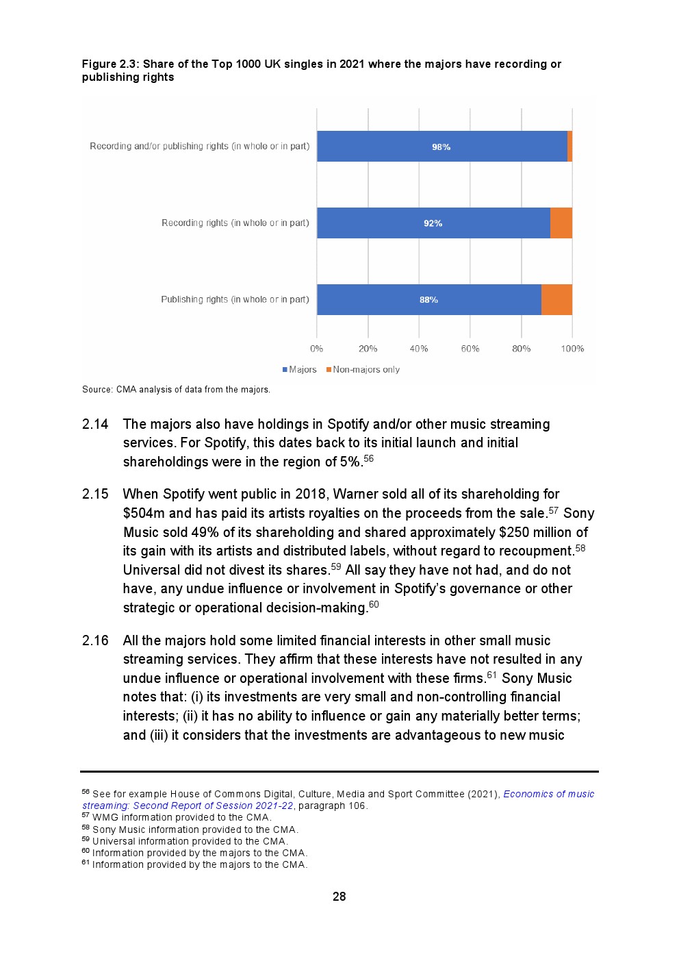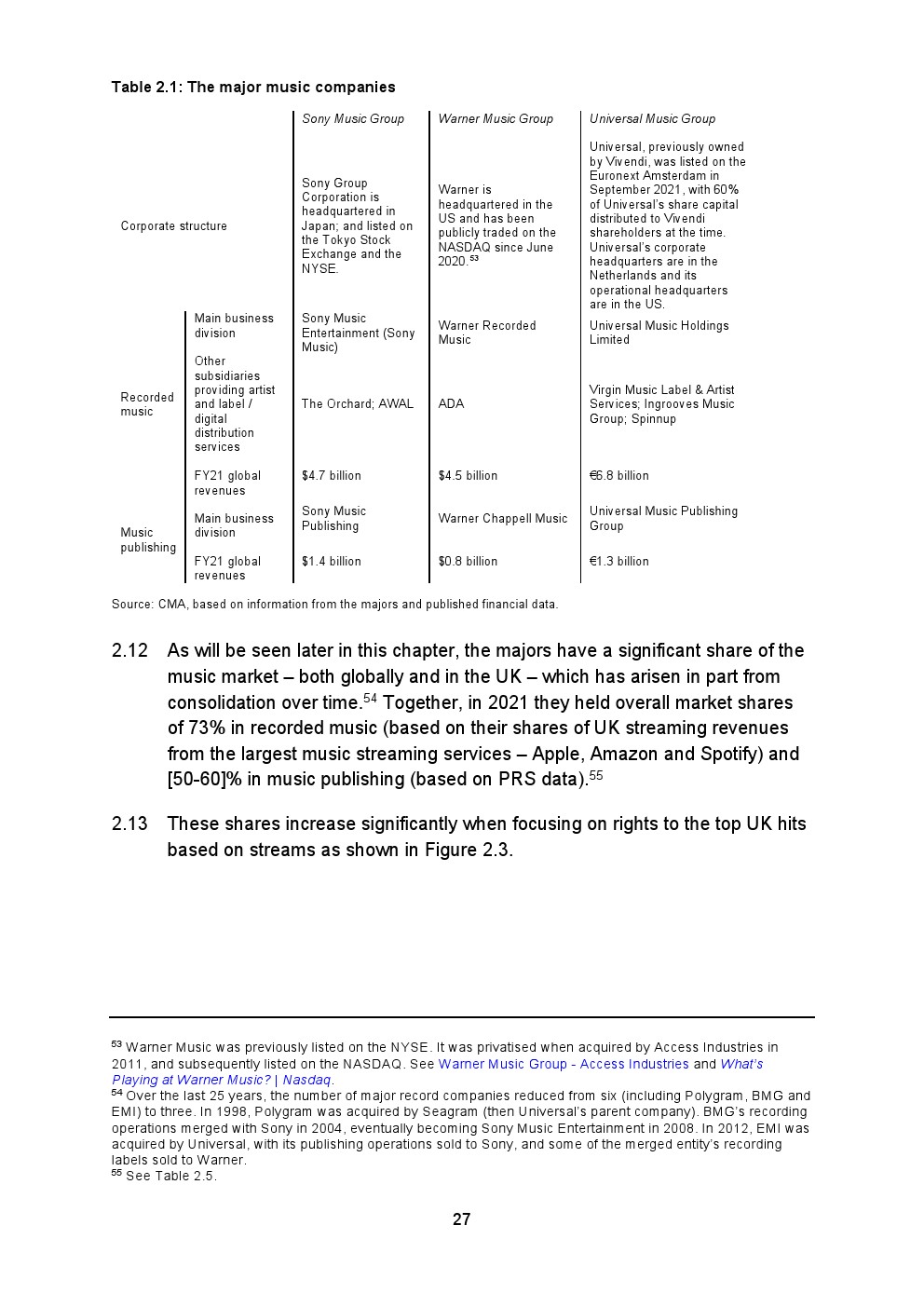 各大巨头在全球和英国的音乐市场中占有很大份额,这在一定程度上是由于随着时间的推移而出现的整合。到 2021 年,它们共同占录制音乐73% 的市场份额和音乐出版的50%-60%。
