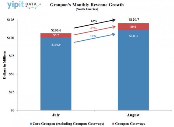 Groupon与在线旅游公司Expedia合作推出的旅游折扣网站Groupon Getaways成为公司业务的重要基石。8月份,该业务的营收为960万美元,与7月份相比增加了近390万美元。