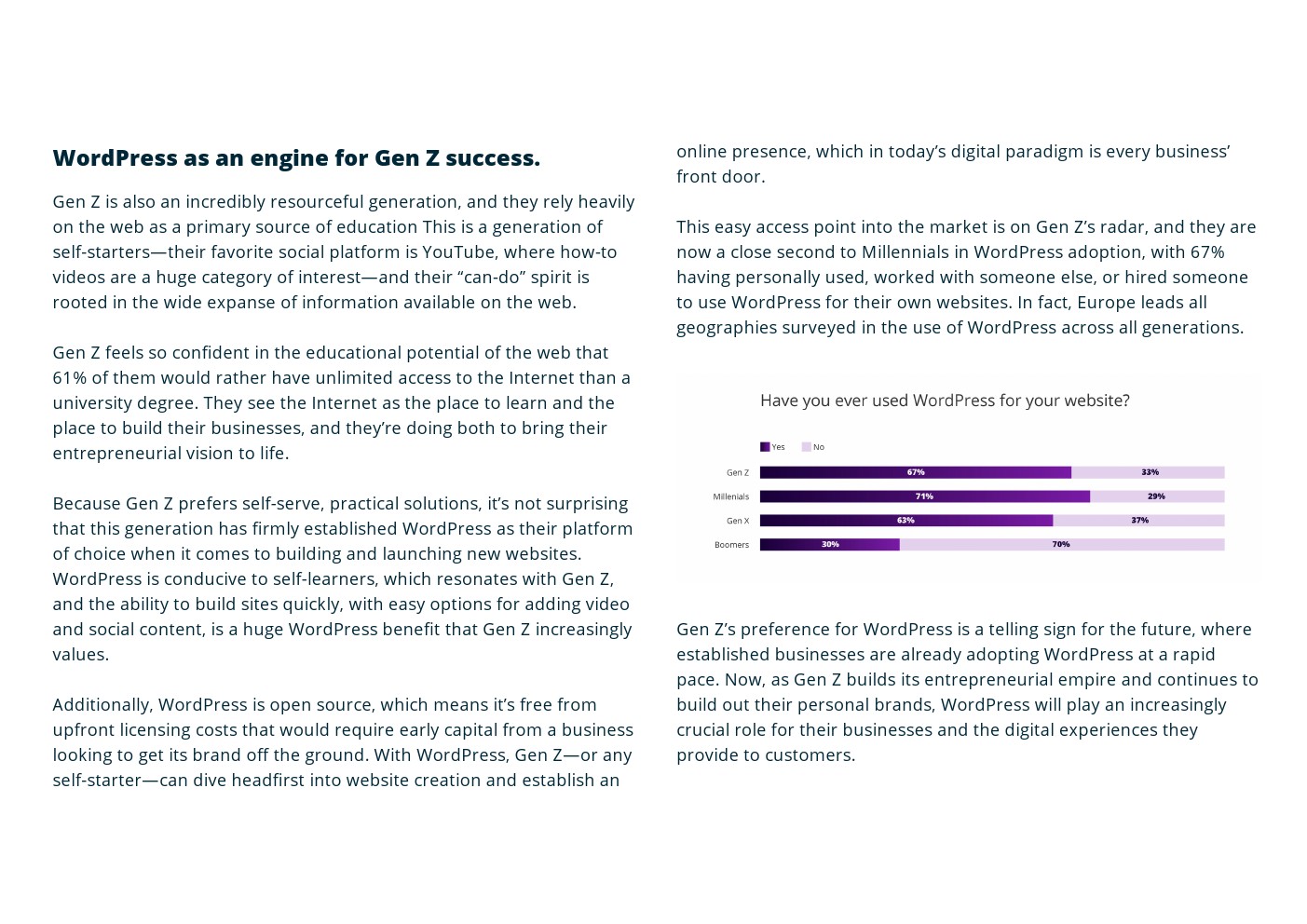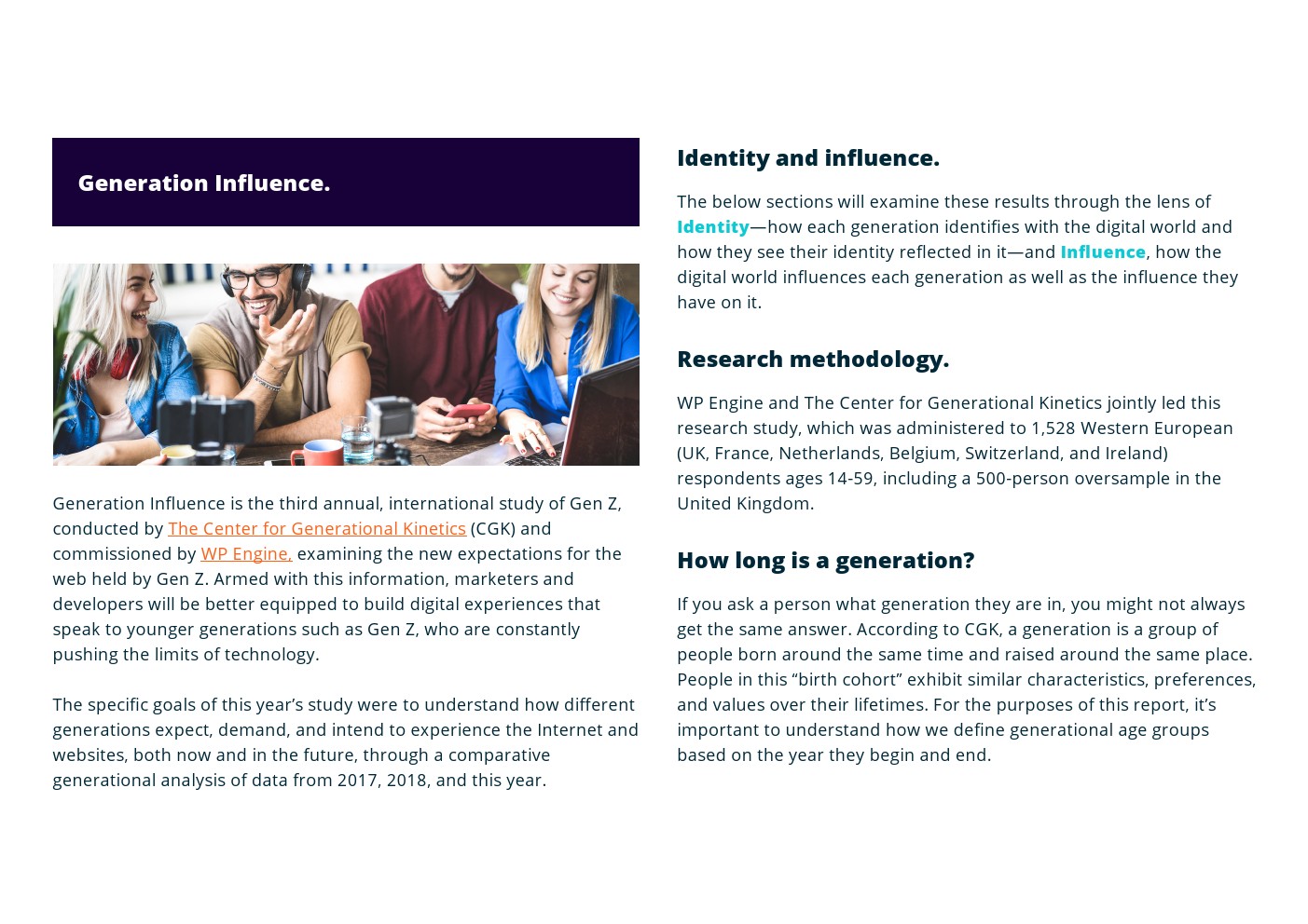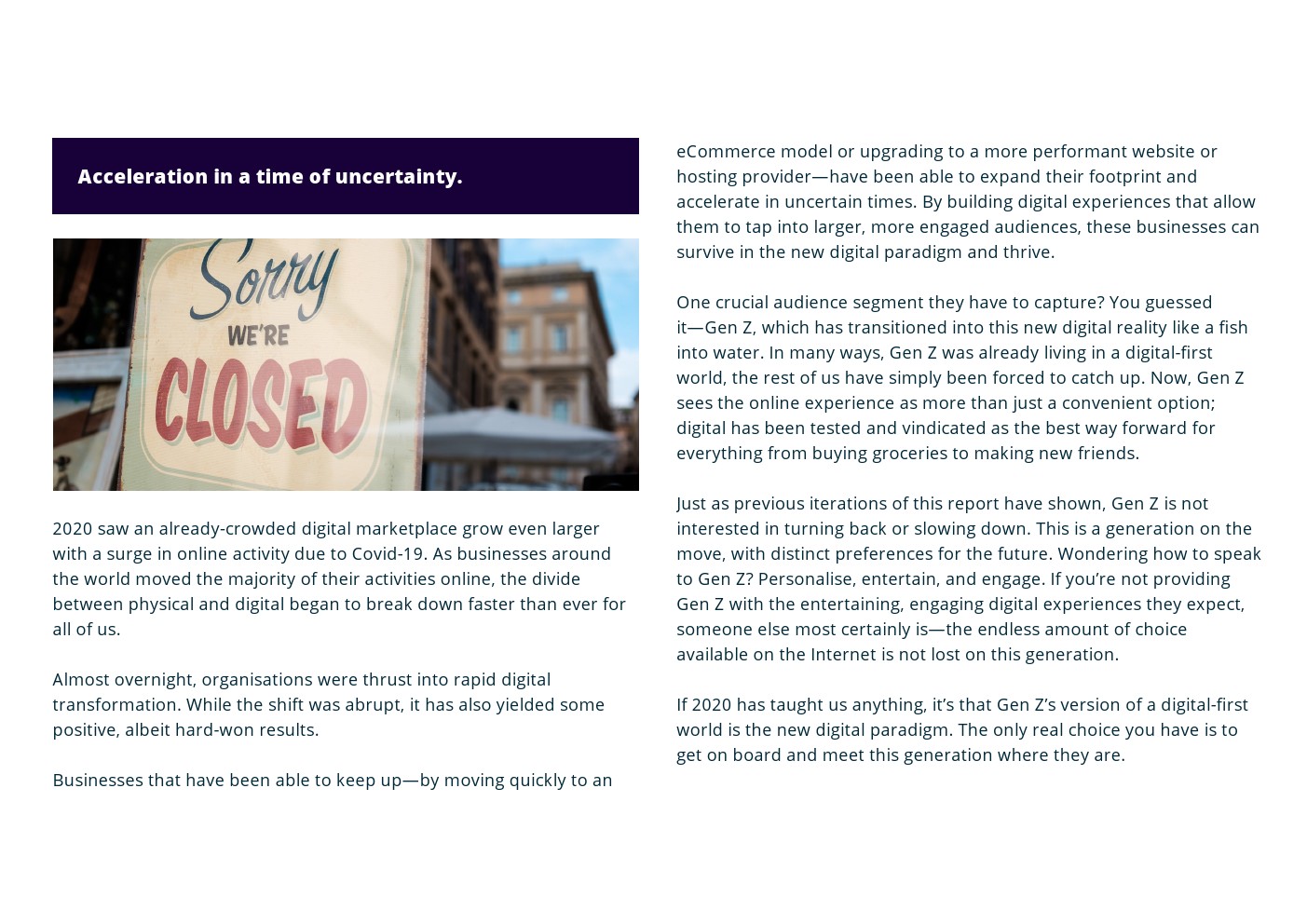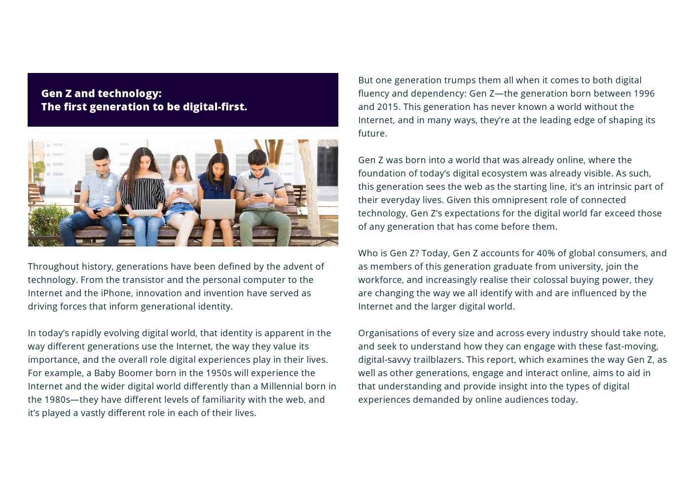 各个行业、各种规模的组织都应该注意,并设法了解他们如何才能与这些快速发展、精通数字技术的开拓者打交道。 这份报告考察了 Z 世代以及其他几代人在线参与和互动的方式,旨在帮助理解并深入了解当今在线受众所需的数字体验类型。
