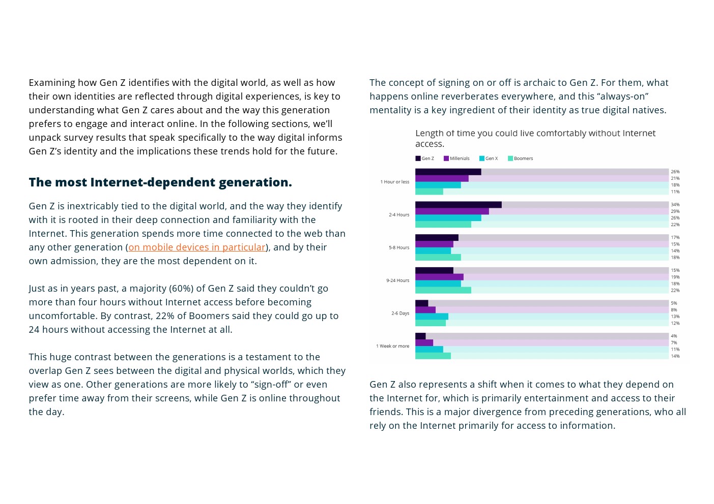 在当今快速发展的数字世界中,这种身份在不同世代使用互联网的方式、他们重视互联网程度以及数字体验在他们生活中发挥的整体作用中显而易见。
