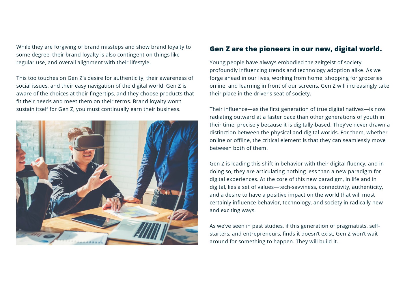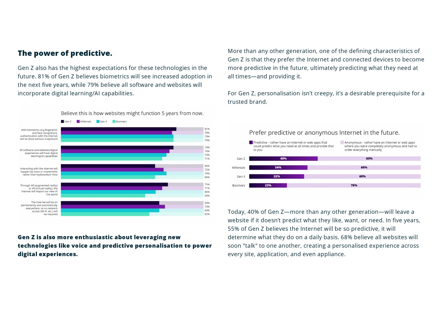 Z 世代出生于一个已经联网的世界,当今数字生态系统的基础已经可见。因此,这一代人将网络视为起点,这是他们日常生活中不可或缺的一部分。 鉴于互联技术无处不在的作用,Z 世代对数字世界的期望远远超过他们之前的任何一代人。