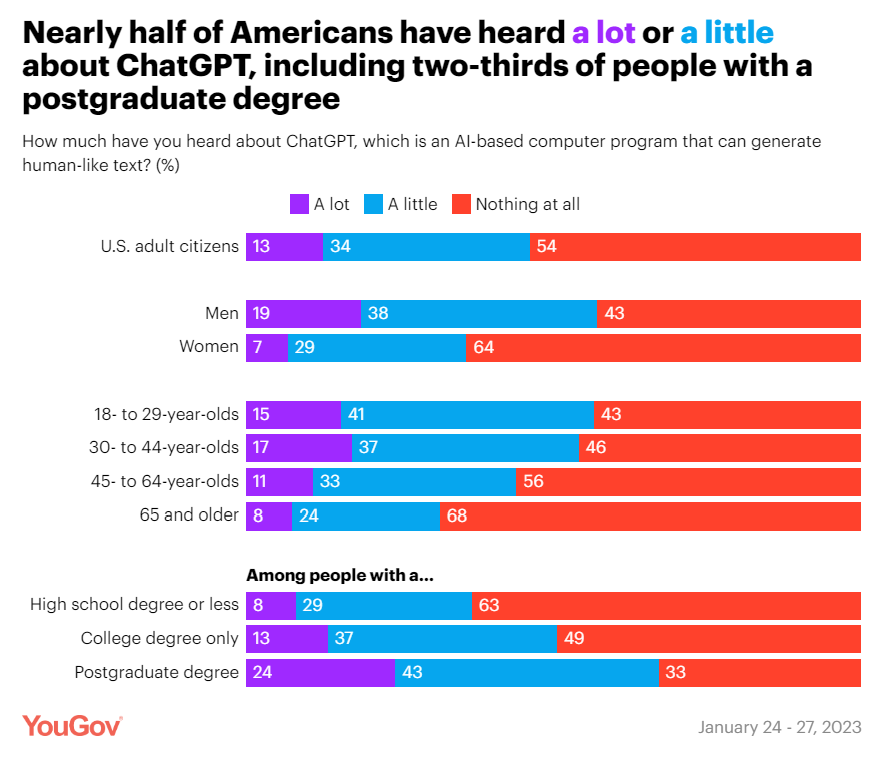 虽然大多数美国人(54%) “根本没有听说过”ChatGPT,但 34% 的人表示听说过一点,13% 的人表示他们听过多次。男性、年轻人和受过高等教育的美国人更熟悉该软件。