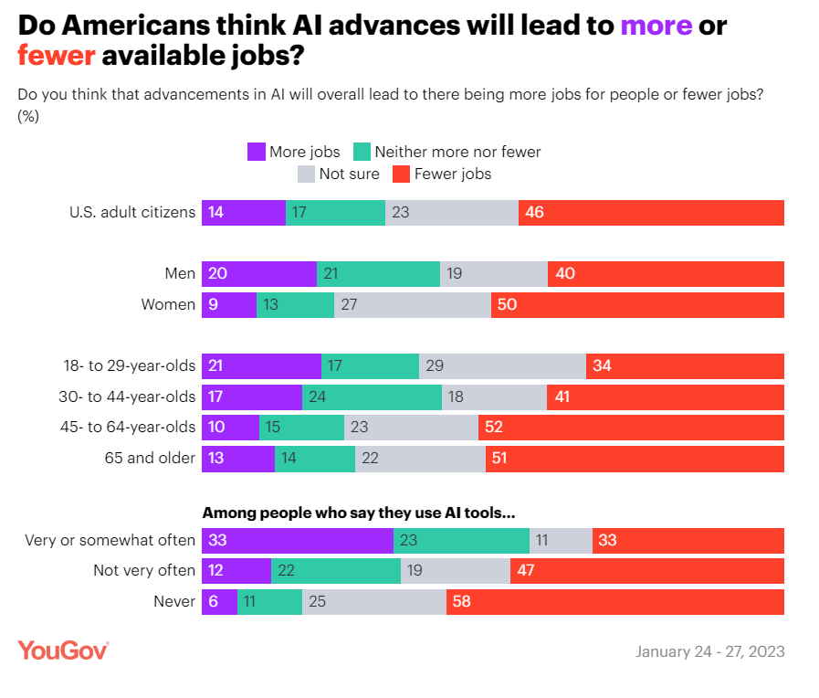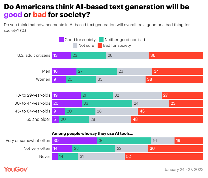 根据 YouGov 最近的一项民意调查,不到一半的美国人(46%) 至少听说过 OpenAI新人工智能文本生成程序,只有 6% 的人使用过它。与许多新技术一样,基于人工智能的文本生成引发了关于它将如何影响社会的不同意见,尽管更多的美国人认为负面的多于正面的。虽然一些人认为这项技术会让事情变得更好,但其他人持怀疑态度,尤其是在人工智能对就业市场的影响方面。