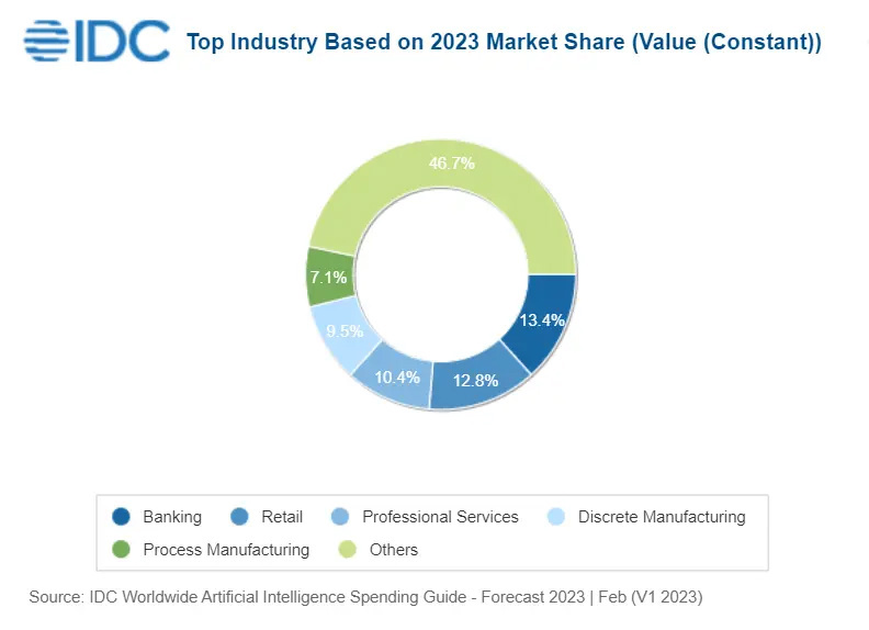 从地域上看,IDC 认为在整个预测期间,美国将占所有人工智能支出的一半以上。西欧占比预估为 20% 以上,中国排在第三(报告中并未提供量化的数字)。
