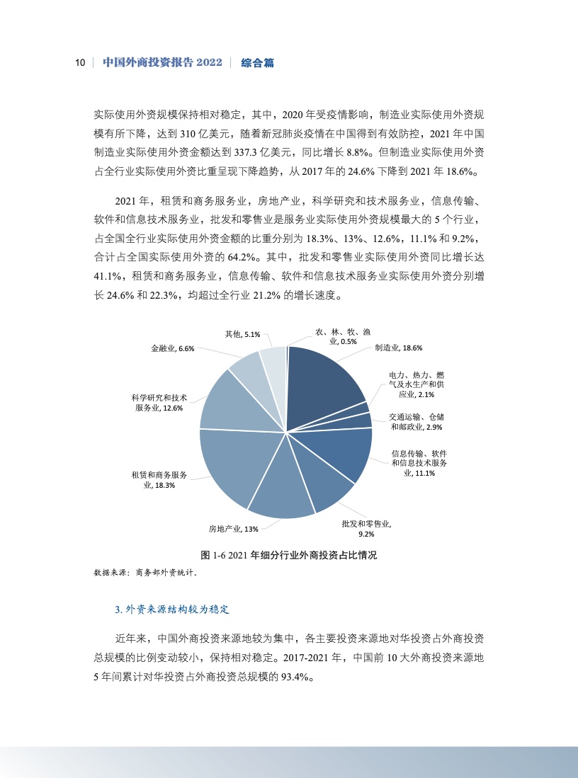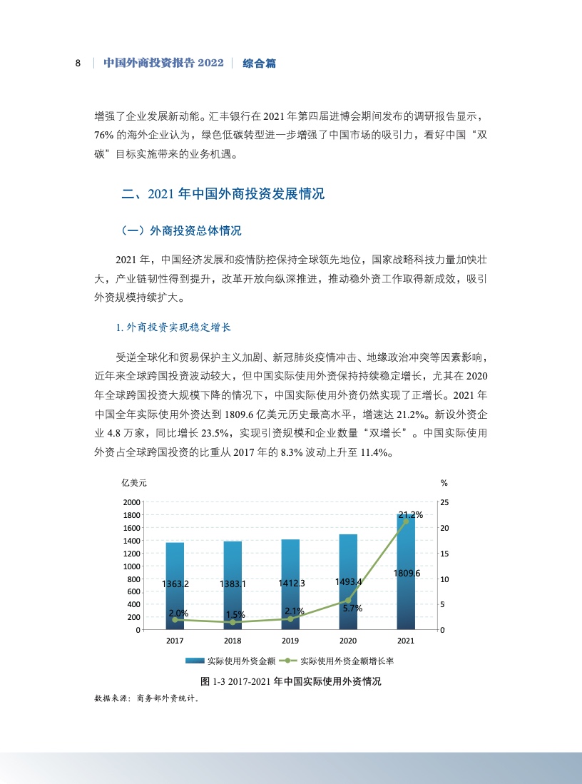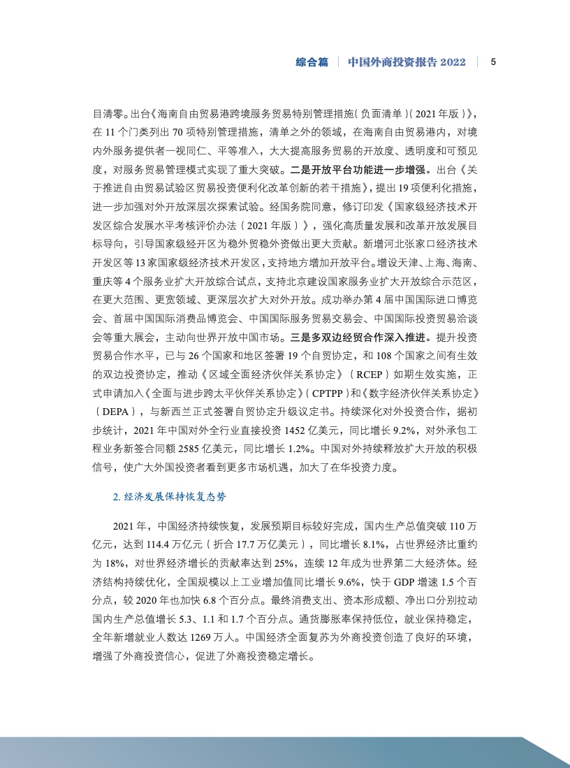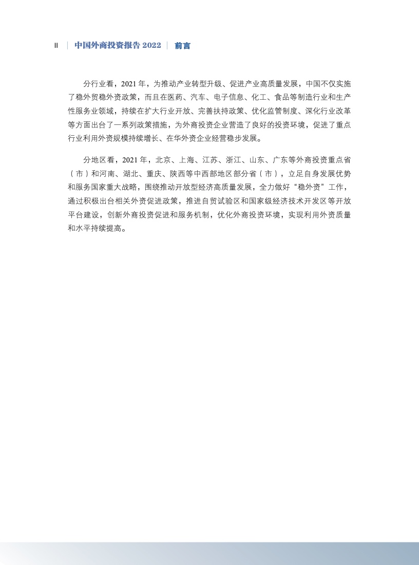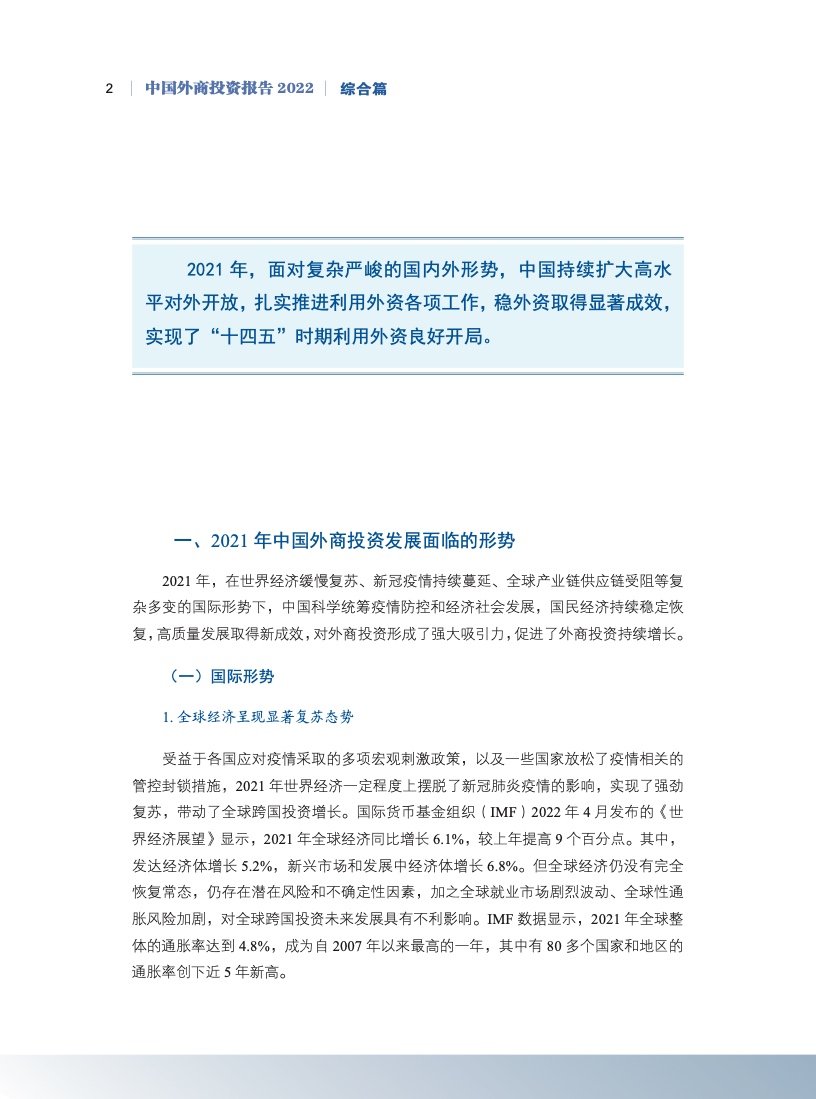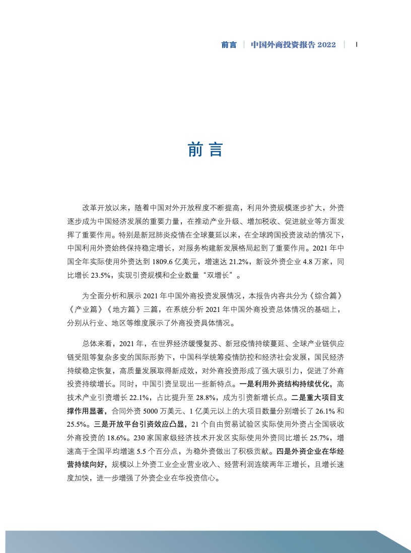 2021 年,在世界经济缓慢复苏、新冠疫情持续蔓延、全球产业链供应 链受阻等复杂多变的国际形势下,中国科学统筹疫情防控和经济社会发展,国民经济 持续稳定恢复,高质量发展取得新成效,对外商投资形成了强大吸引力,促进了外商 投资持续增长。