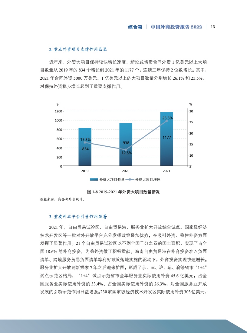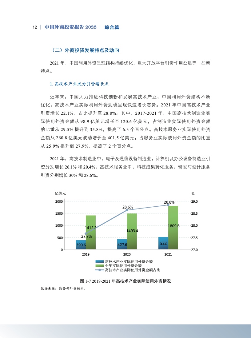 同时,中国引资呈现出一些新特点。一是利用外资结构持续优化,高 技术产业引资增长 22.1%,占比提升至 28.8%,成为引资新增长点。二是重大项目支 撑作用显著,合同外资 5000 万美元、1 亿美元以上的大项目数量分别增长了 26.1% 和 25.5%。三是开放平台引资效应凸显,21 个自由贸易试验区实际使用外资占全国吸收 外商投资的 18.6%。