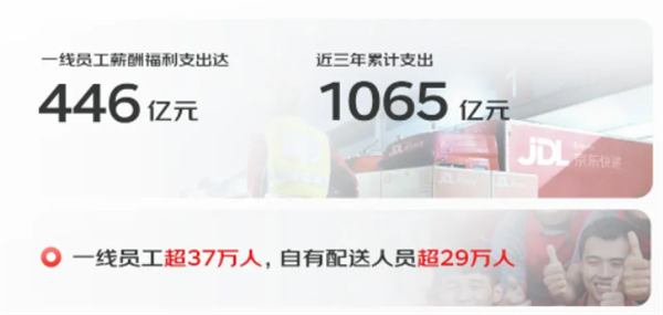 据了解,包括德邦在内,京东物流已拥有超37万一线员工,自由配送人员超29万人,2022年京东物流一线员工薪酬福利支出达446亿元,近三年累计支出1065亿元。