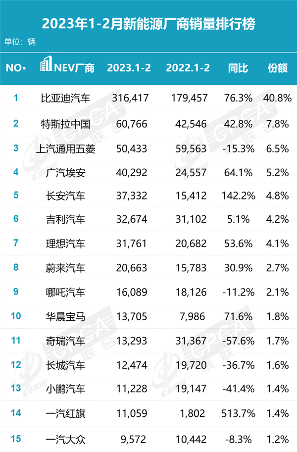 1-2月份累计销量方面,比亚迪以316417辆位居榜首,同样是特斯拉(60766辆)的5倍还多。