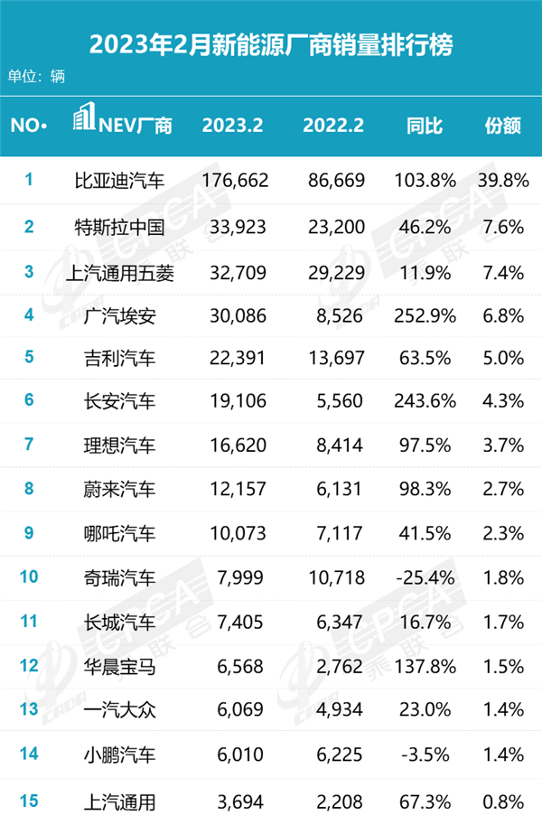 根据2023年2月新能源厂商销量排行榜,比亚迪以176662辆霸榜第一,市场份额39.8%,独孤求败。