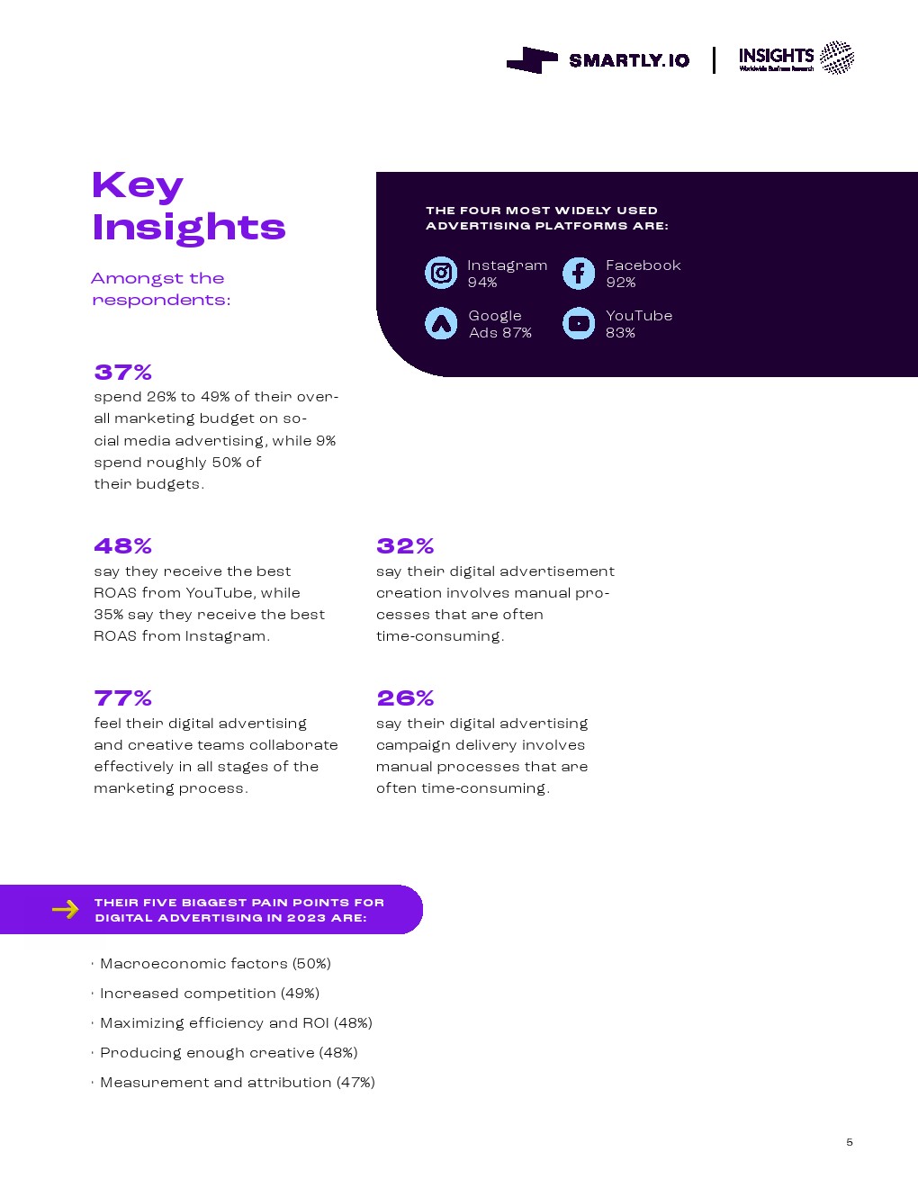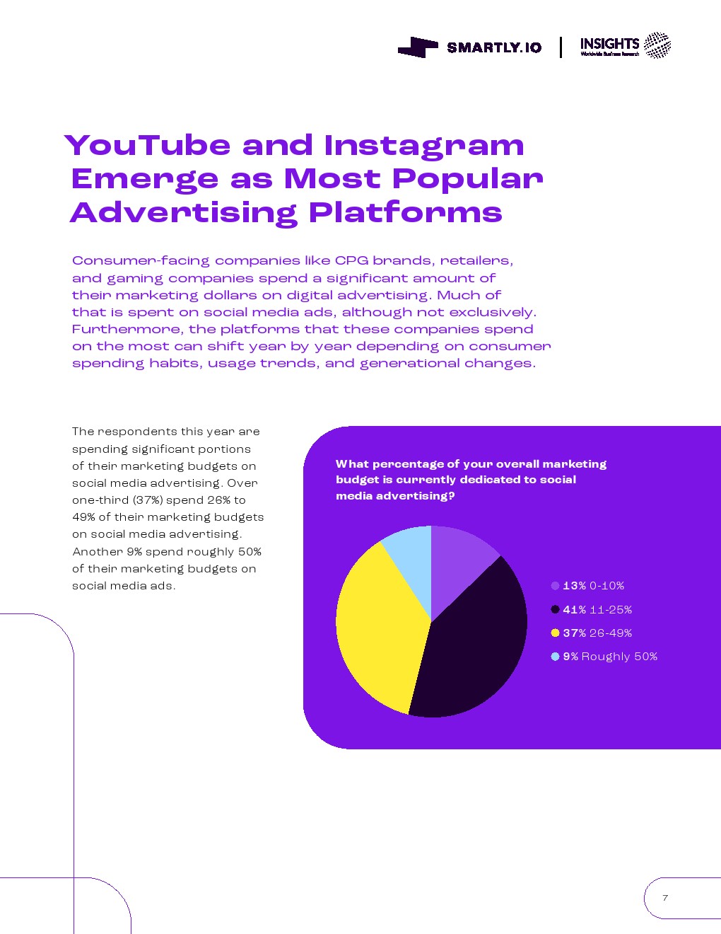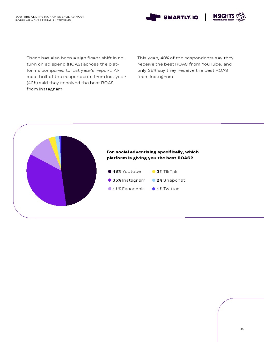 当被问及哪个平台能为他们提供最佳广告支出回报率(ROAS)并特别关注社交广告时,48% 的受访者指出了 YouTube,而Instagram 的这一比例为 35%。其余的平台Facebook(11%)、TikTok(3%)、Snapchat(2%)和 Twitter(1%)远远落后。