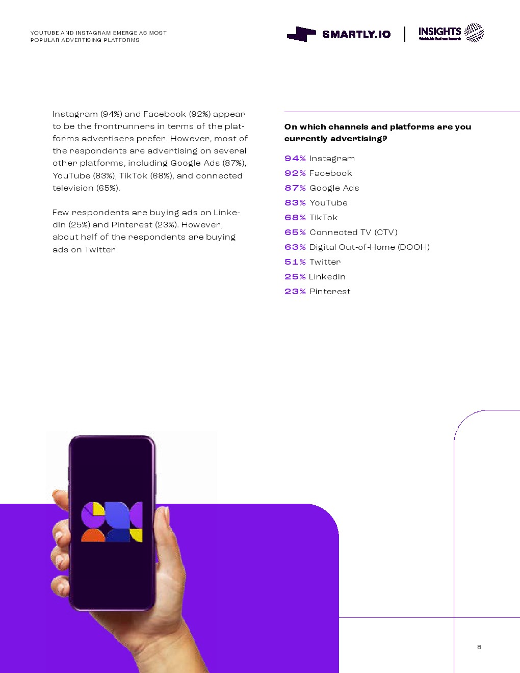 根据报告研究,大多数受访者目前在一系列渠道和平台上投放广告,其中超过8/10的受访者在 Instagram(94%)、Facebook(92%)、谷歌广告(87%) 和 YouTube(83%) 上投放广告。TikTok(68%)、联网电视(65%) 和数字户外广告(63%) 也很受欢迎;LinkedIn(25%) 和 Pinterest(23%) 作为广告平台的吸引力较小。