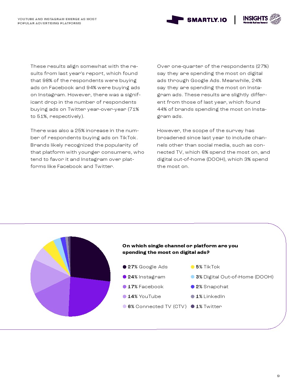 分别有 27% 和 24% 的受访者表示谷歌广告和 Instagram是他们在数字广告上花费最多的渠道或平台。Facebook(17%) 和 YouTube(14%) 紧随其后。