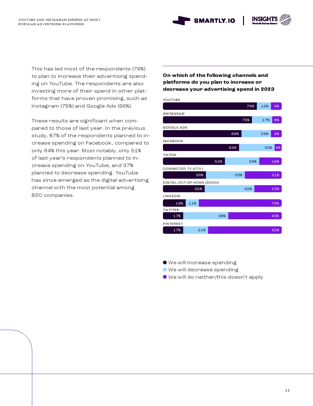 大约 79% 的人计划增加他们在YouTube平台上的广告支出;相比之下,75% 的人对 Instagram 持相同看法;66% 的人计划增加 Google广告;52% 的人计划增加在 TikTok 上的广告支出。