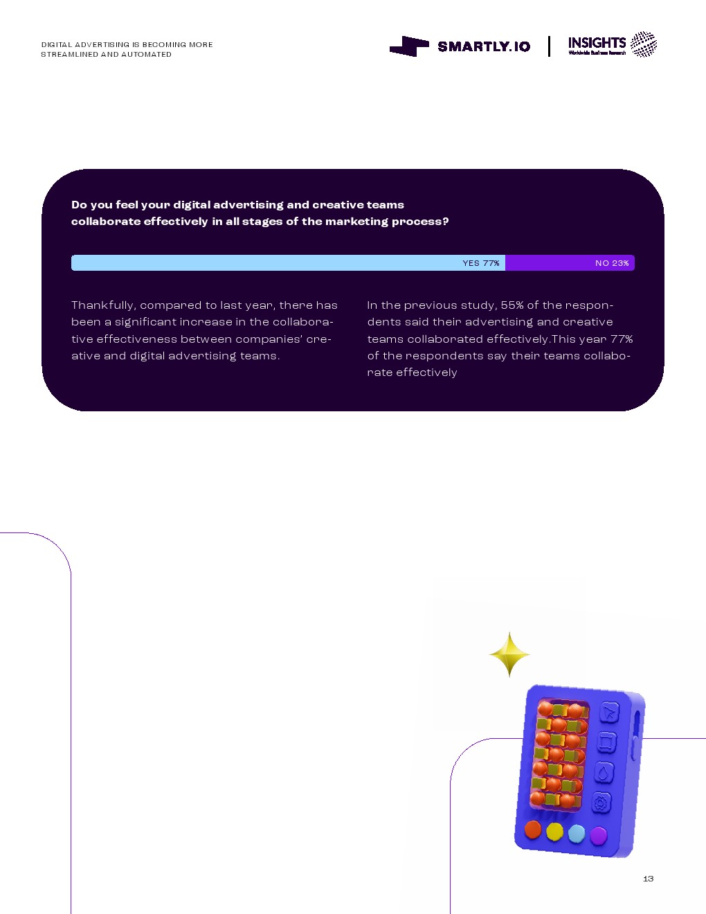 令人鼓舞的是, 77%的受访者认为他们的数字广告和创意团队在营销过程的所有阶段都能有效协作。