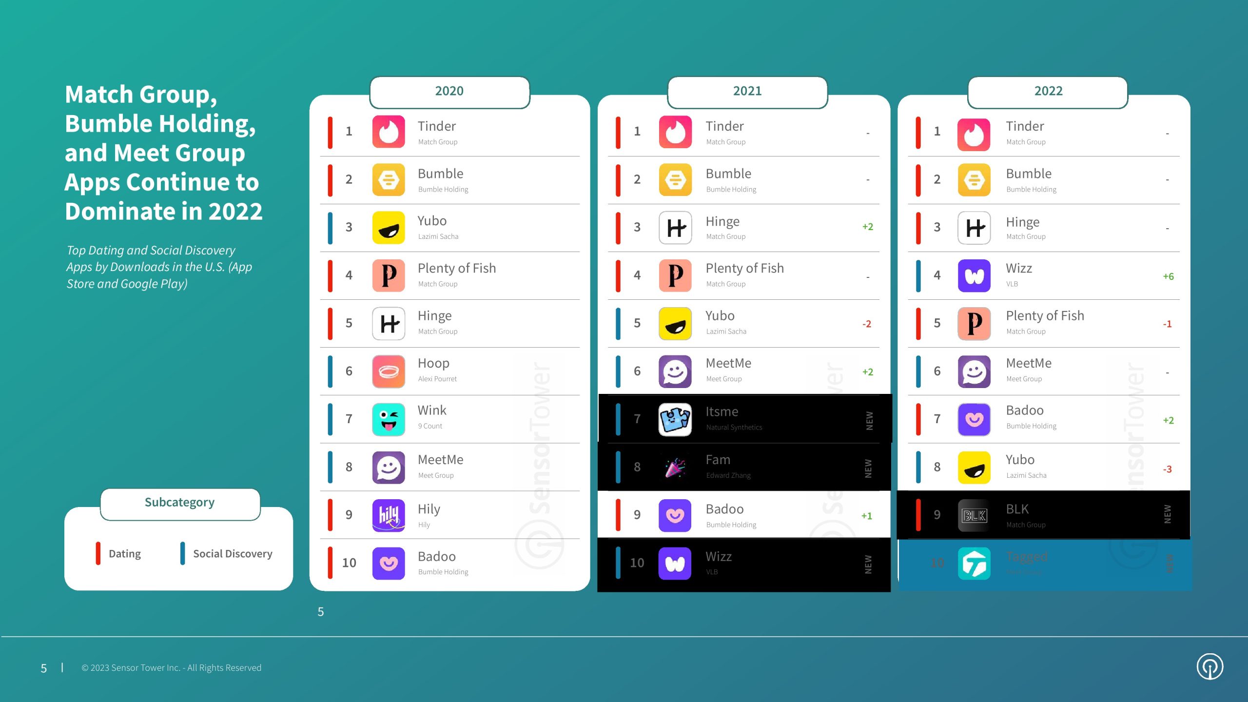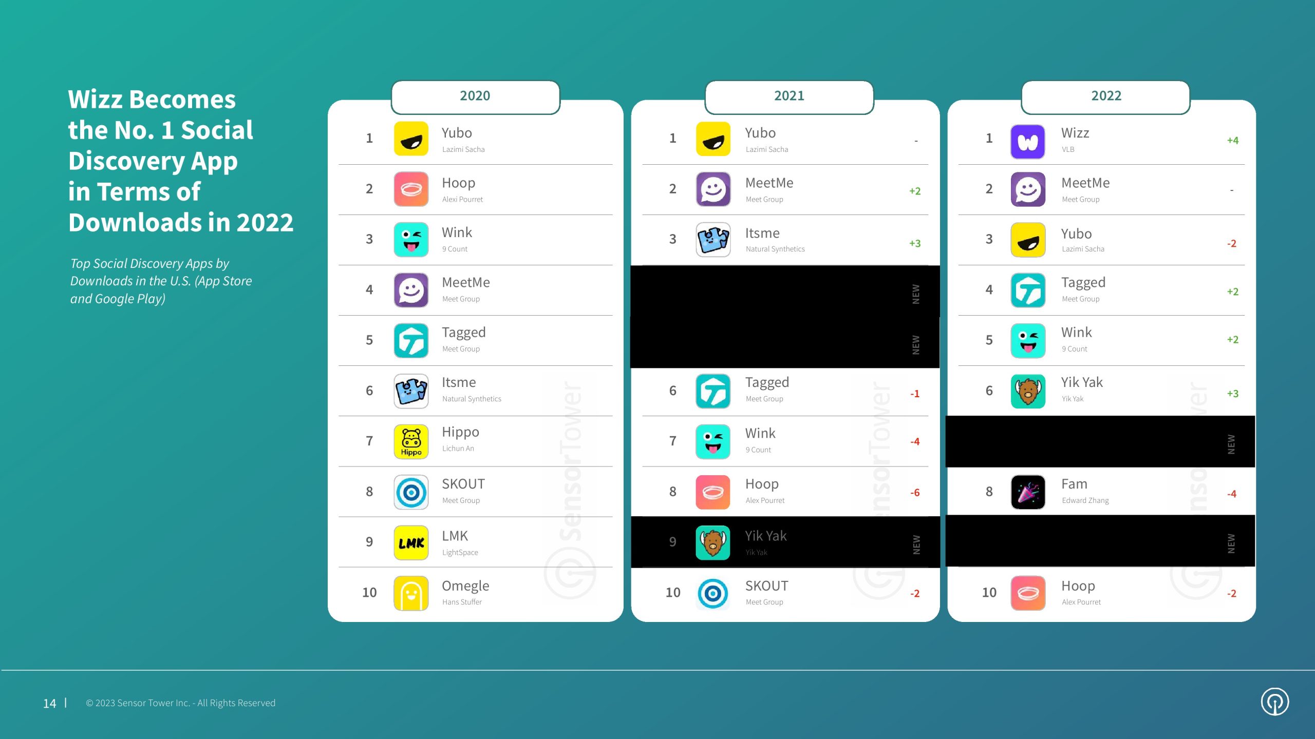 社交发现应用主要侧重于让用户结交新朋友,事实证明它是移动应用市场的一个动态领域。从 2021 年到 2022 年,安装量最高的十大应用大多数都在改变位置。在更广泛的约会和社交发现类别中,Wizz 凭借其在 2021 年取得的成果跃升至第五名,并在 2022 年登上第一名,安装量比之前第二名的应用程序——MeetMe高出 45% 以上。