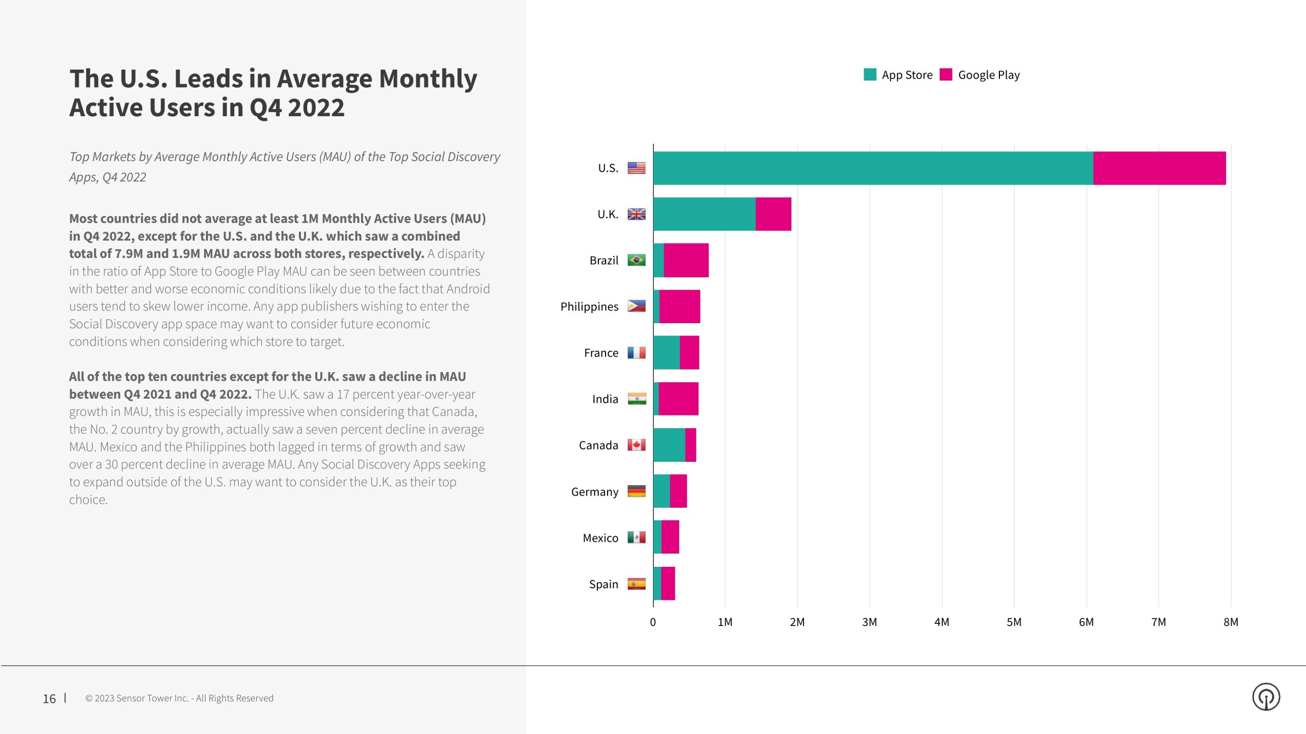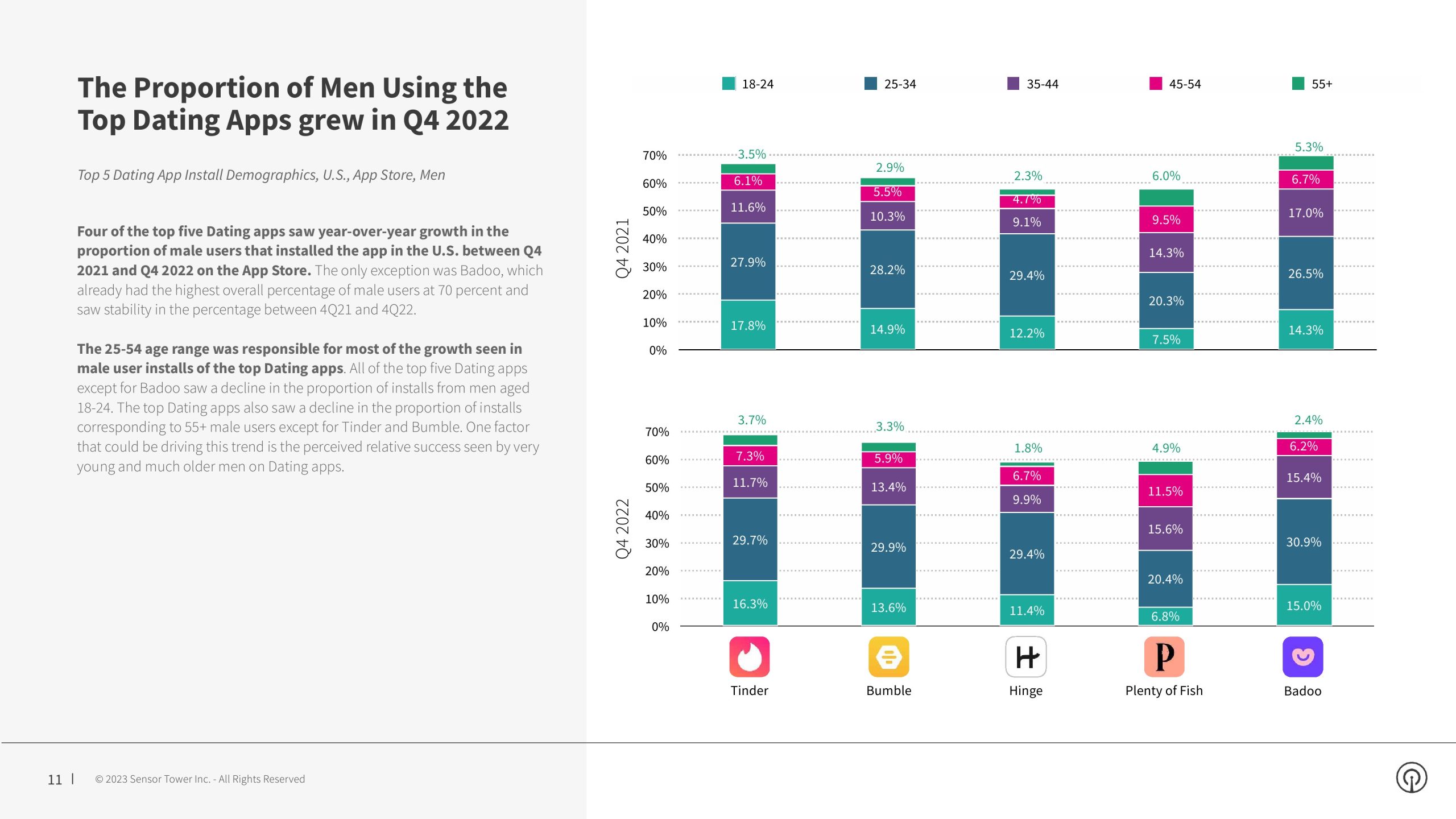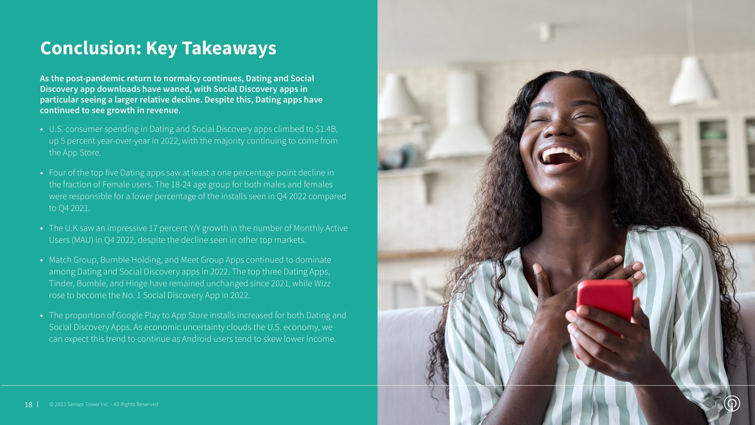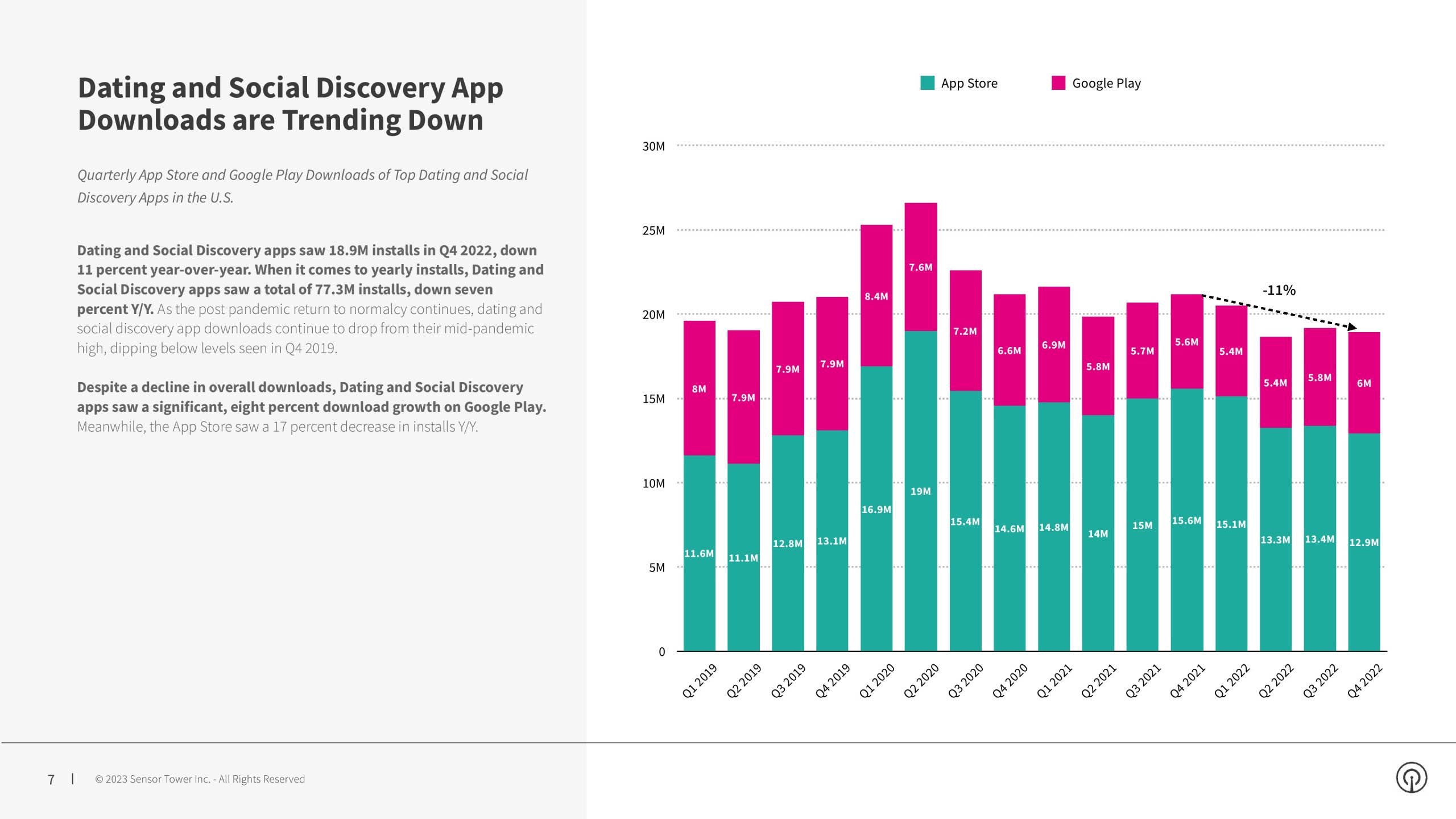 尽管整体下载量有所下降,但约会和社交发现应用在谷歌Play上的下载量却有8%的显著增长。与此同时,App Store的安装量下降了17%。