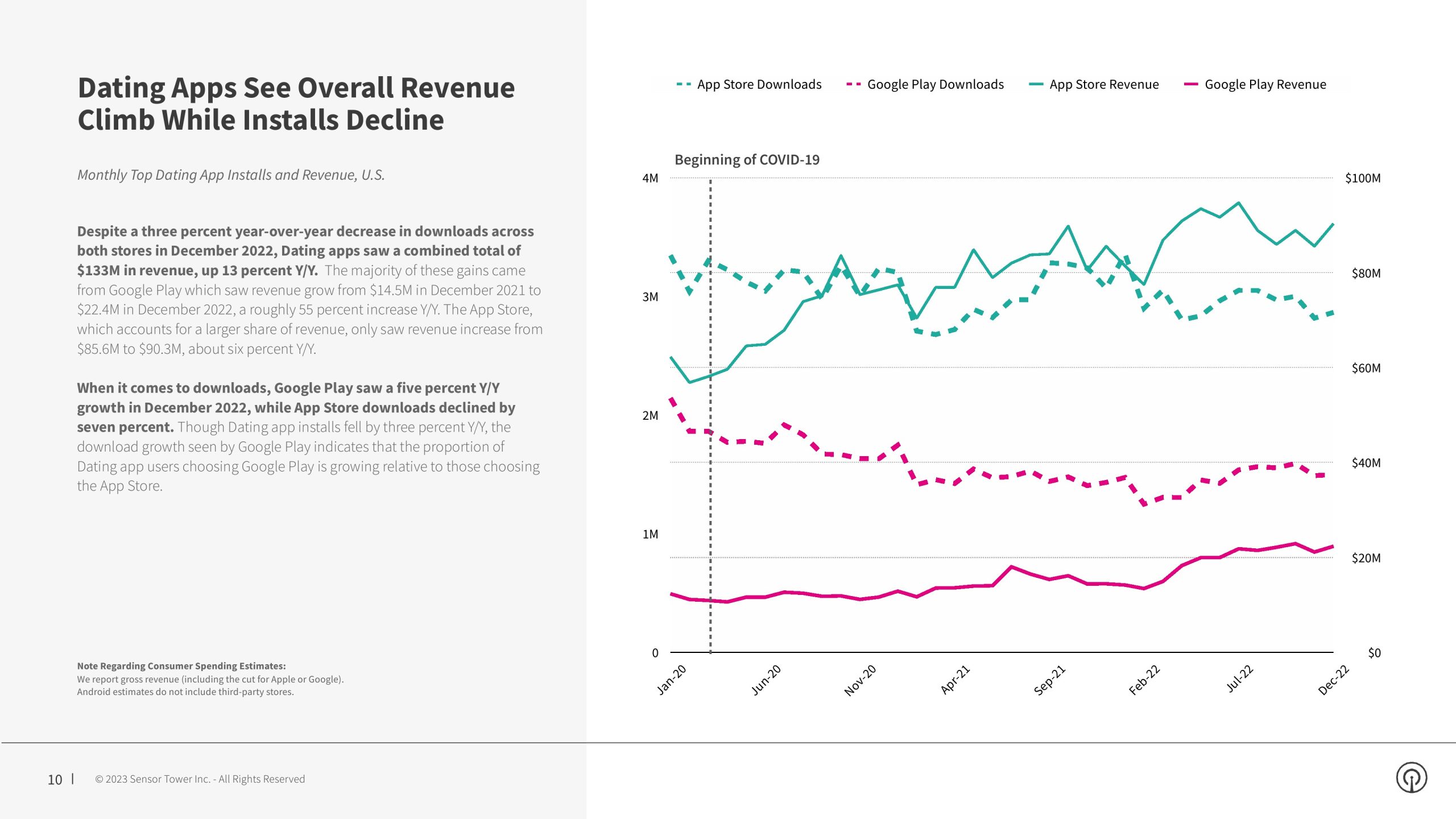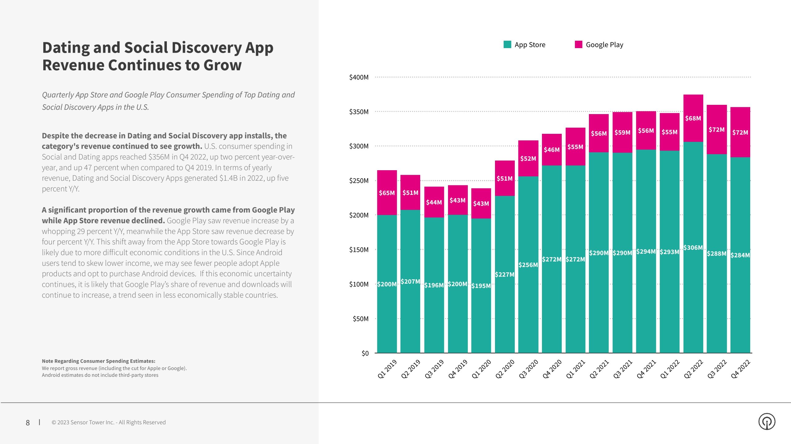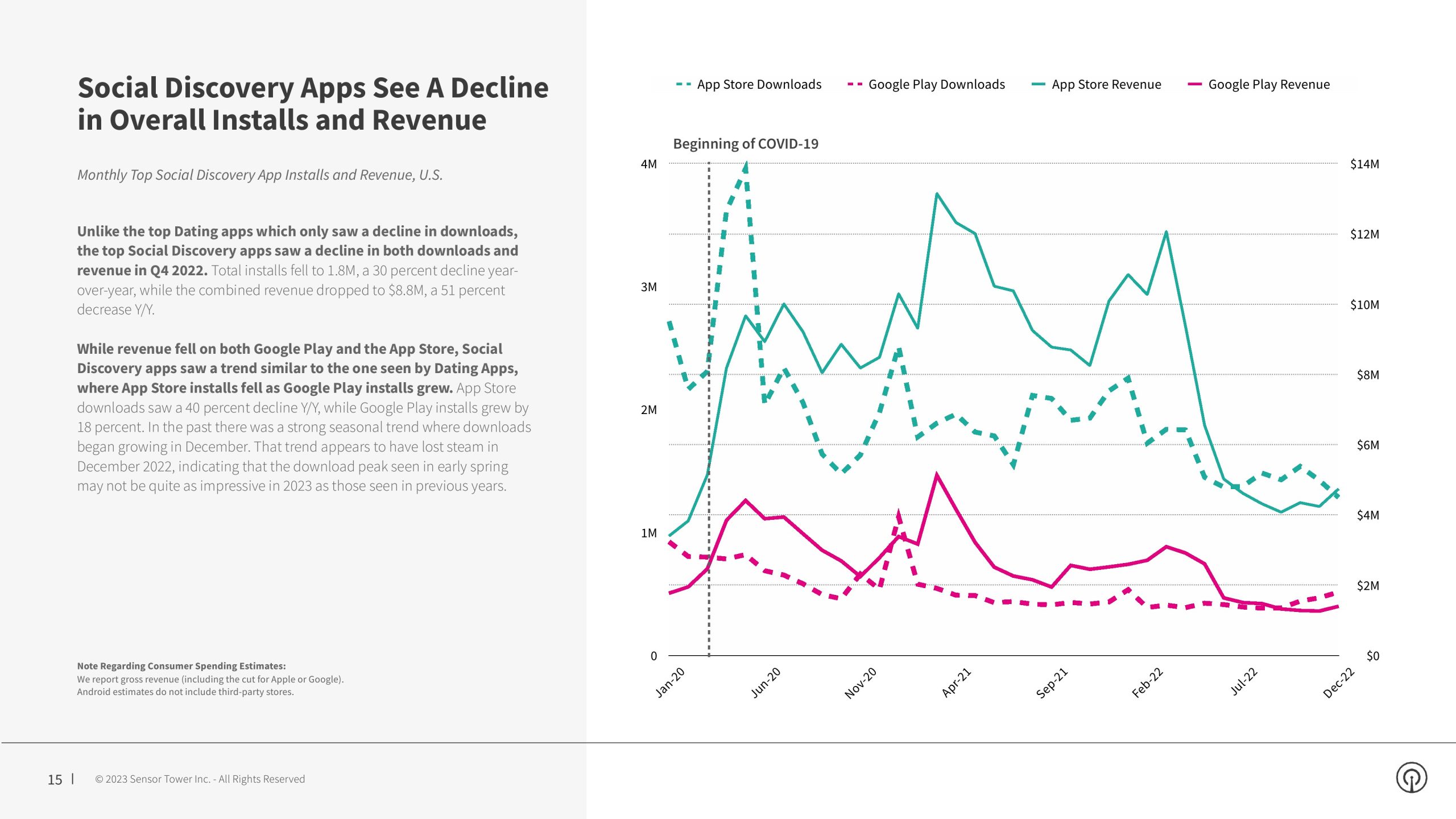 虽然约会和社交发现类别在 2020 年前两个季度的早期新冠期间安装量显著增长,但下载水平在 2021 年开始恢复到 2019 年的水平。令人惊讶的是,下载量在 2022 年继续进一步下降,这是过去四年来的最低安装量。尽管出现这种下降,但收入仍在增长,总收入在 2022 年第一季度达到 3.74 亿美元的峰值,并在 2022 年整体同比增长 5%。2022年第四季度,美国消费者在社交和约会应用程序上的支出达到3.56亿美元,同比增长2%,与2019年第四季度相比增长47%。2022年约会和社交发现应用程序产生了14亿美元收入,同比增长5%。
