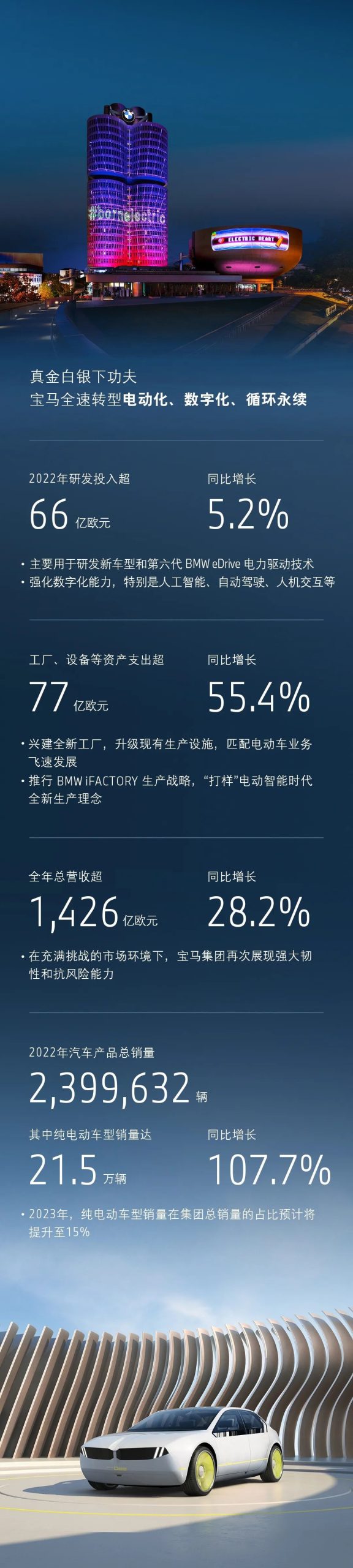 该公司表示,2023 年将全力以赴电动化,目标是将纯电动车型销量在集团总销量中的占比提升至 15%。据悉,宝马集团将于 3 月 15 日举行财报年会,感兴趣的小伙伴可以关注一下。