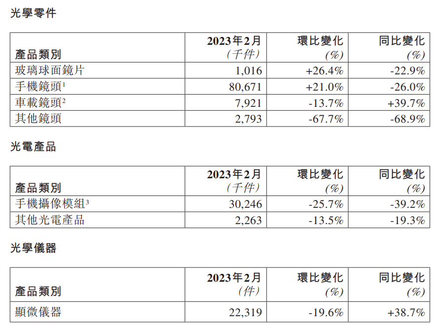 舜宇光学表示,手机镜头出货量同比下降 26.0%,主要是因为去年同期出货量基数较高且现时整体智能手机市场需求仍然疲软;环比上升 21.0%,主要是因为 1 月份有春节假期而使得出货量基数较低。