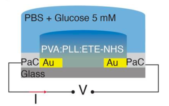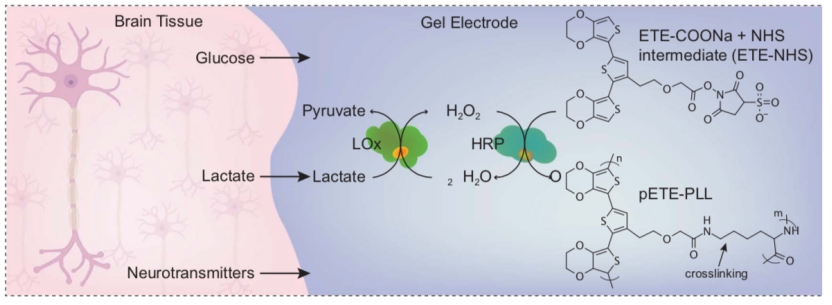 凝胶被注射进体内之后,周围组织中的小分子代谢物扩散进入凝胶,氧气被ROx催化氧化成H2O2,HRP再将H2O2水解,同时ETE单体被转化为自由基,进行后续聚合反应。多聚ETE-NHS再与PLL交联,黏度增大,形成稳定的凝胶电极。最终形成的电极形状与结构由注射物的成分和注射部位的组织微环境共同决定。