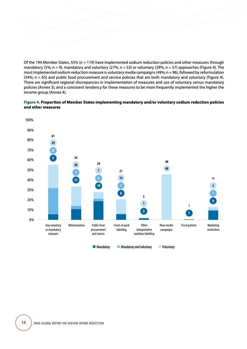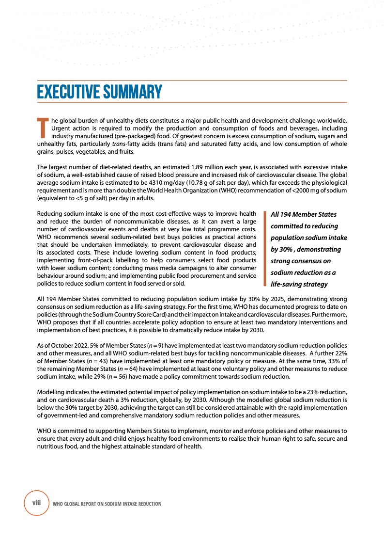 据《报告》显示,全球只有5%的世卫组织会员国受到强制性全面减钠政策的保护,而73%的会员国还未能充分实施此类政策。如果实施高成本效益的减钠政策,到2030年,估计可在全球挽救约700万人的生命。