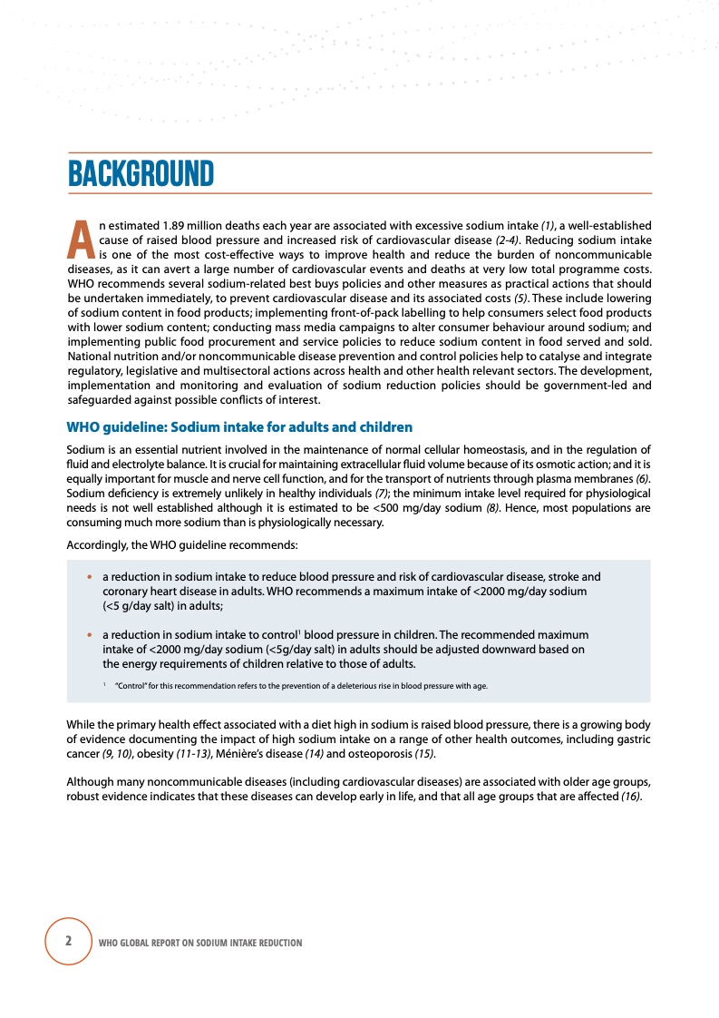 钠是维持人体机能的必需营养素,但摄入过量则会导致高血压,并增加患心脏病、中风和过早死亡的风险。同时,越来越多证据表明,高钠摄入与胃癌、肥胖、骨质疏松症和肾脏疾病等其他健康问题的风险增加有关。