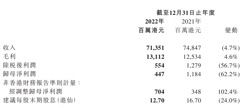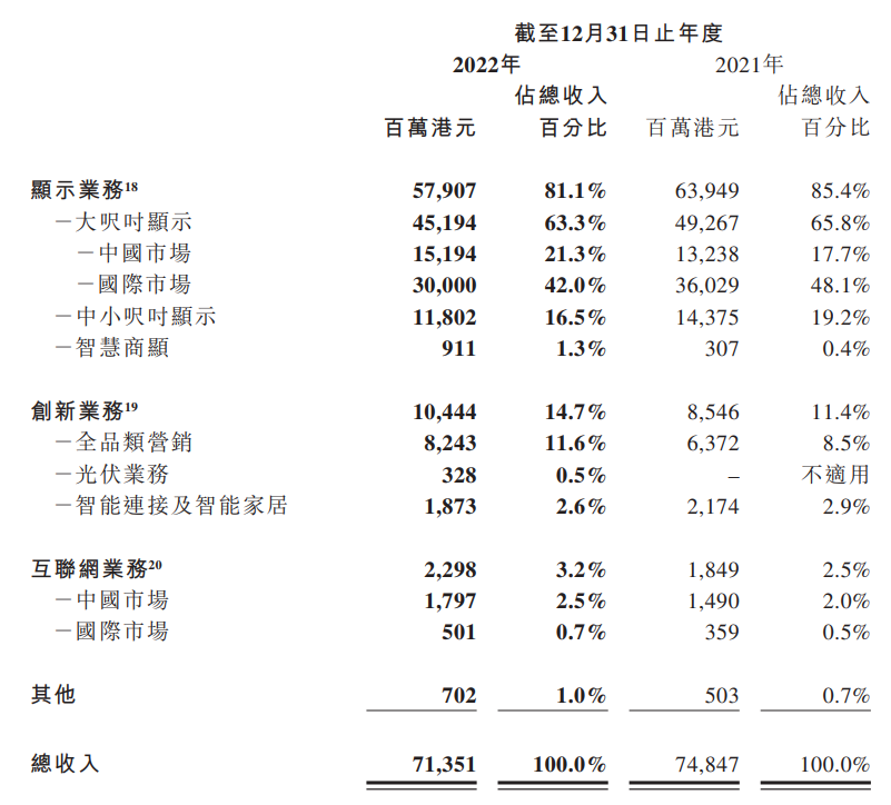 创新业务收入达 104.44 亿港元(当前约 92.53 亿元人民币),同比增长 22.2%,其中全品类营销业务收入同比增长 29.4% 至 82.43 亿港元(当前约 73.03 亿元人民币),且毛利率同比提升 2.1 个百分点至 13.2%;光伏业务自 2022 年第二季度起运营,全年共创收 3.28 亿港元(当前约 2.91 亿元人民币);互联网业务收入达 22.98 亿港元(当前约 20.36 亿元人民币),同比增长 24.3%。
