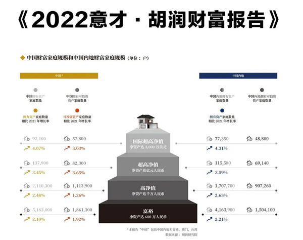 报告显示,截至2022年1月1日,中国600万元资产“富裕家庭”较上年增长2.1%,达518万户,比上年增加10万户;千万元资产“高净值家庭”较上年增长2.5%,达211万户,比上年增加5万户;亿元资产“超高净值家庭”较上年增长3.5%,达13.8万户,比上年增加4600户。