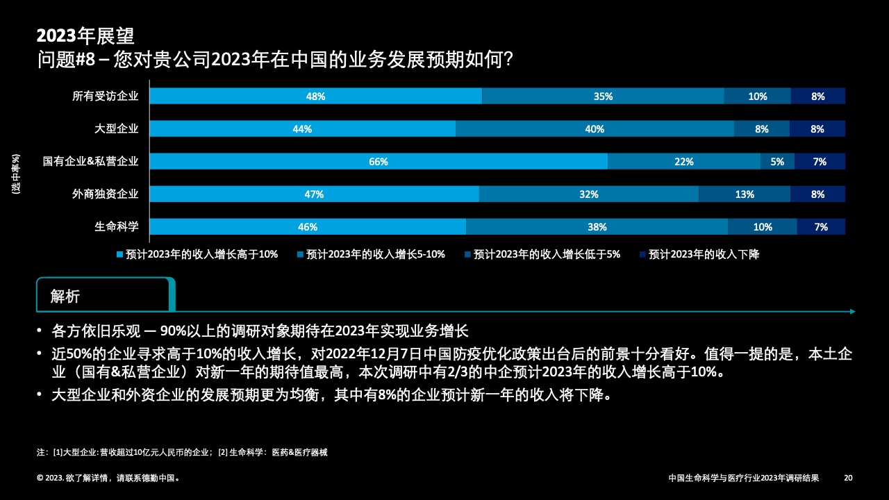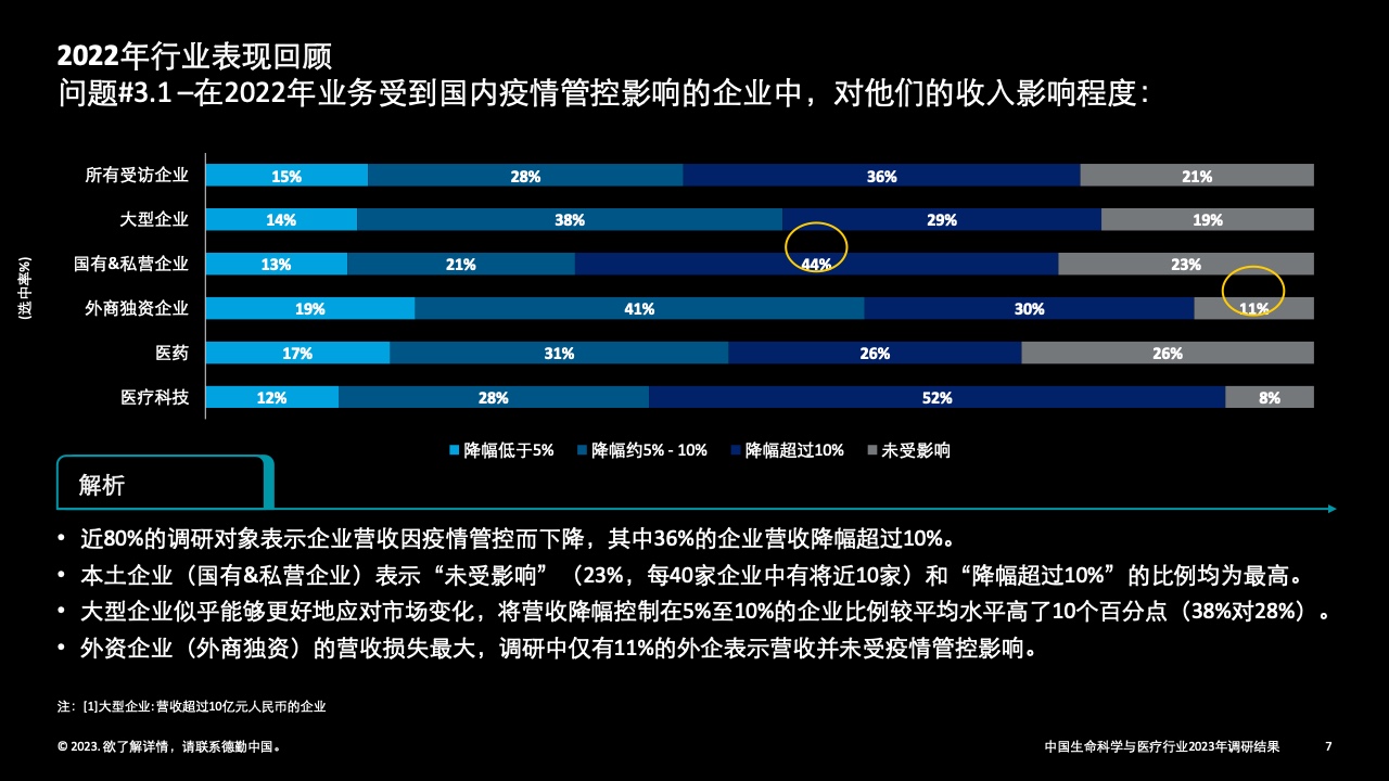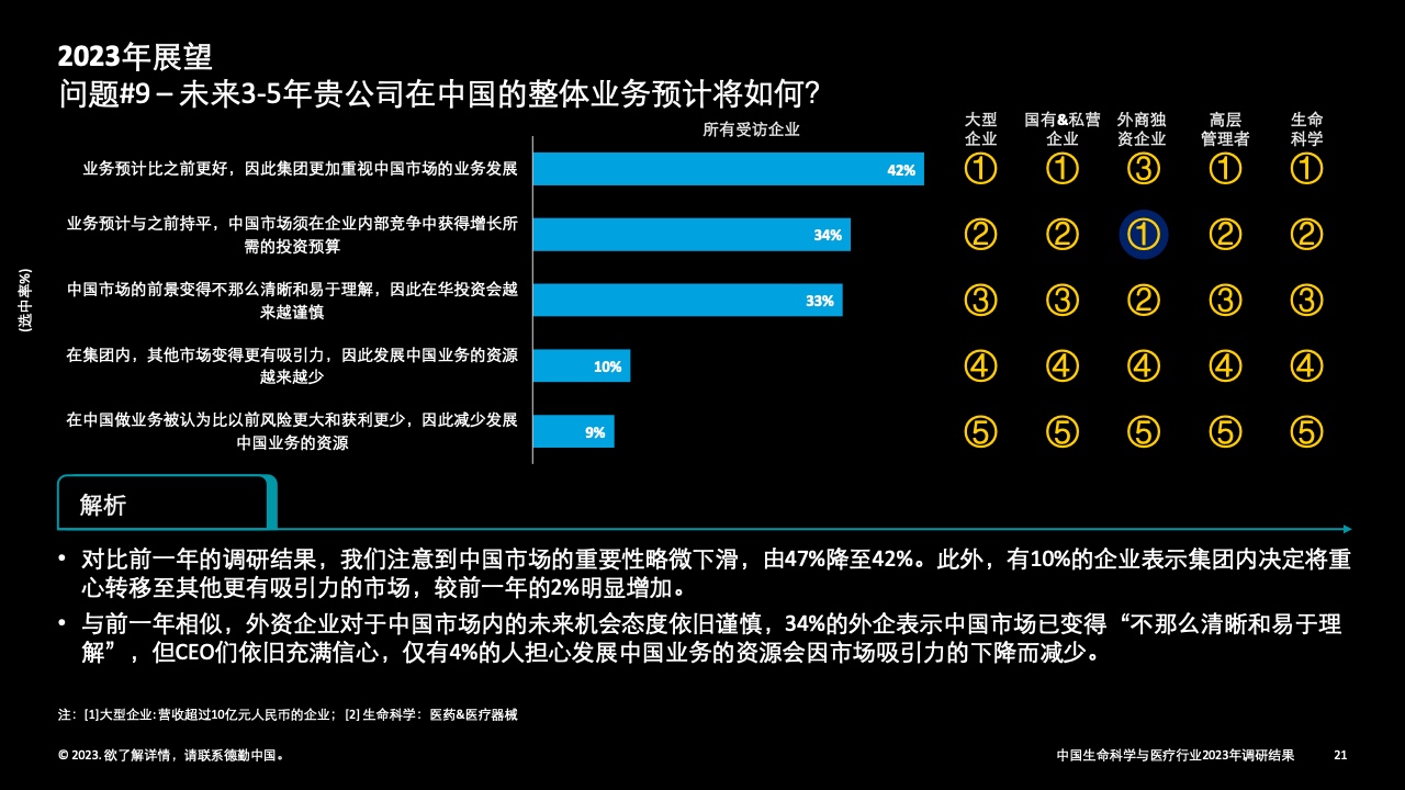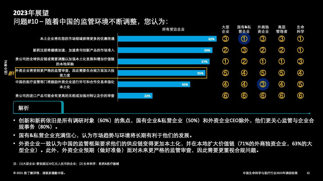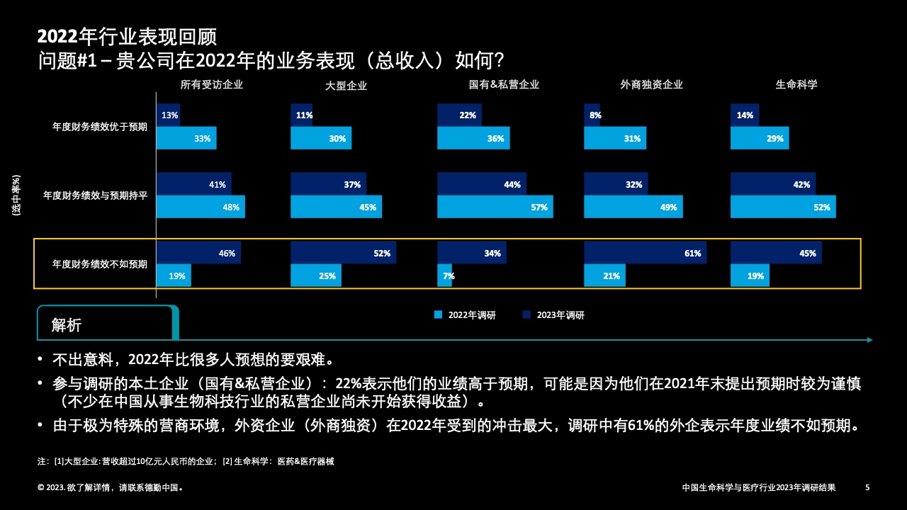 参与调研的本土企业(国有企业&私营企业):22%表示他们的业绩高于预期,可能是因为他们在2021年末提出预期时较为谨慎(不少在中国从事生物科技行业的私营企业尚未开始获得收益)。