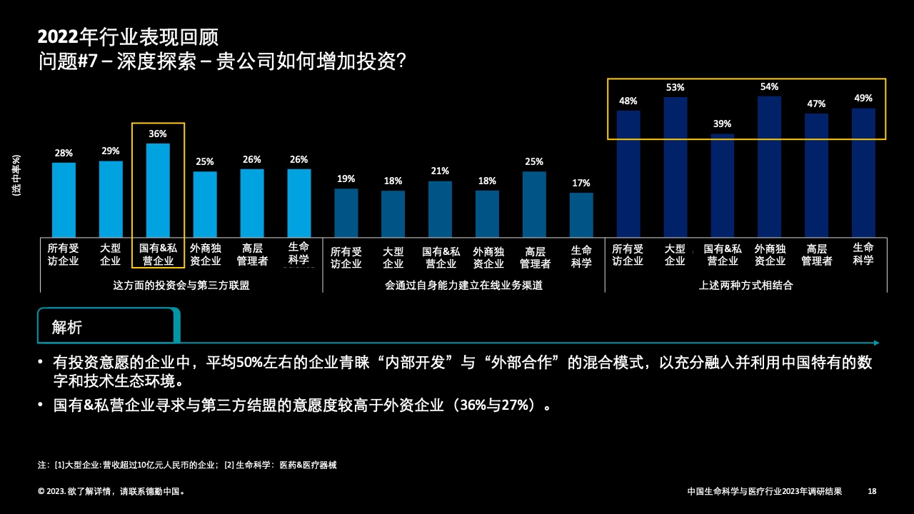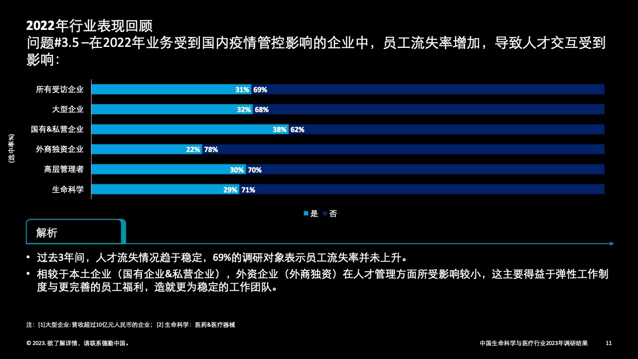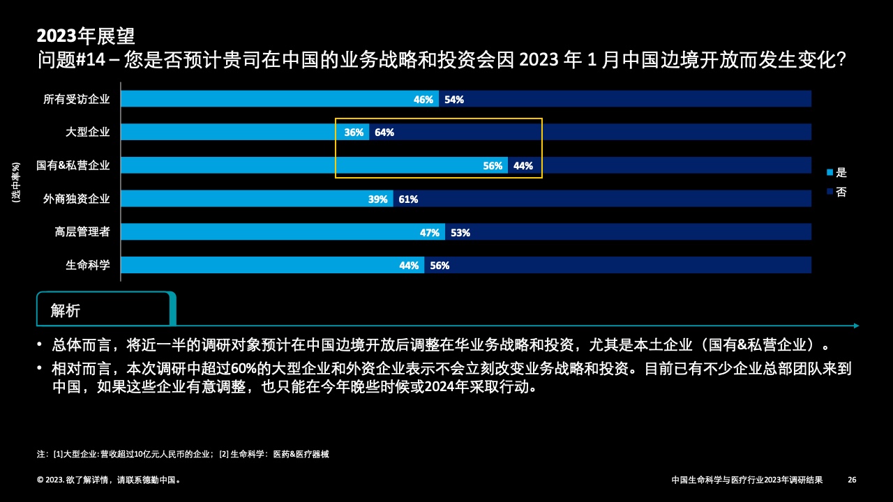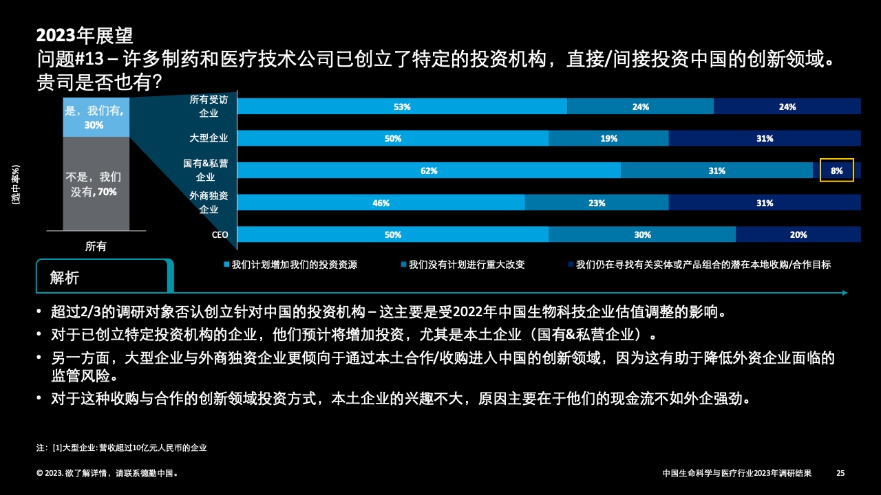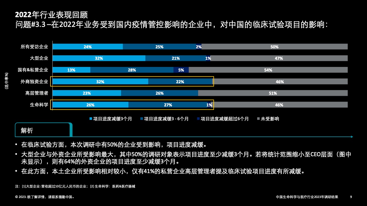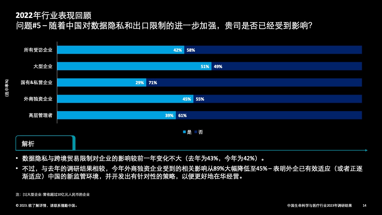 参与调研的本土企业(国有企业&私营企业):22%表示他们的业绩高于预期,可能是因为他们在2021年末提出预期时较为谨慎(不少在中国从事生物科技行业的私营企业尚未开始获得收益)。