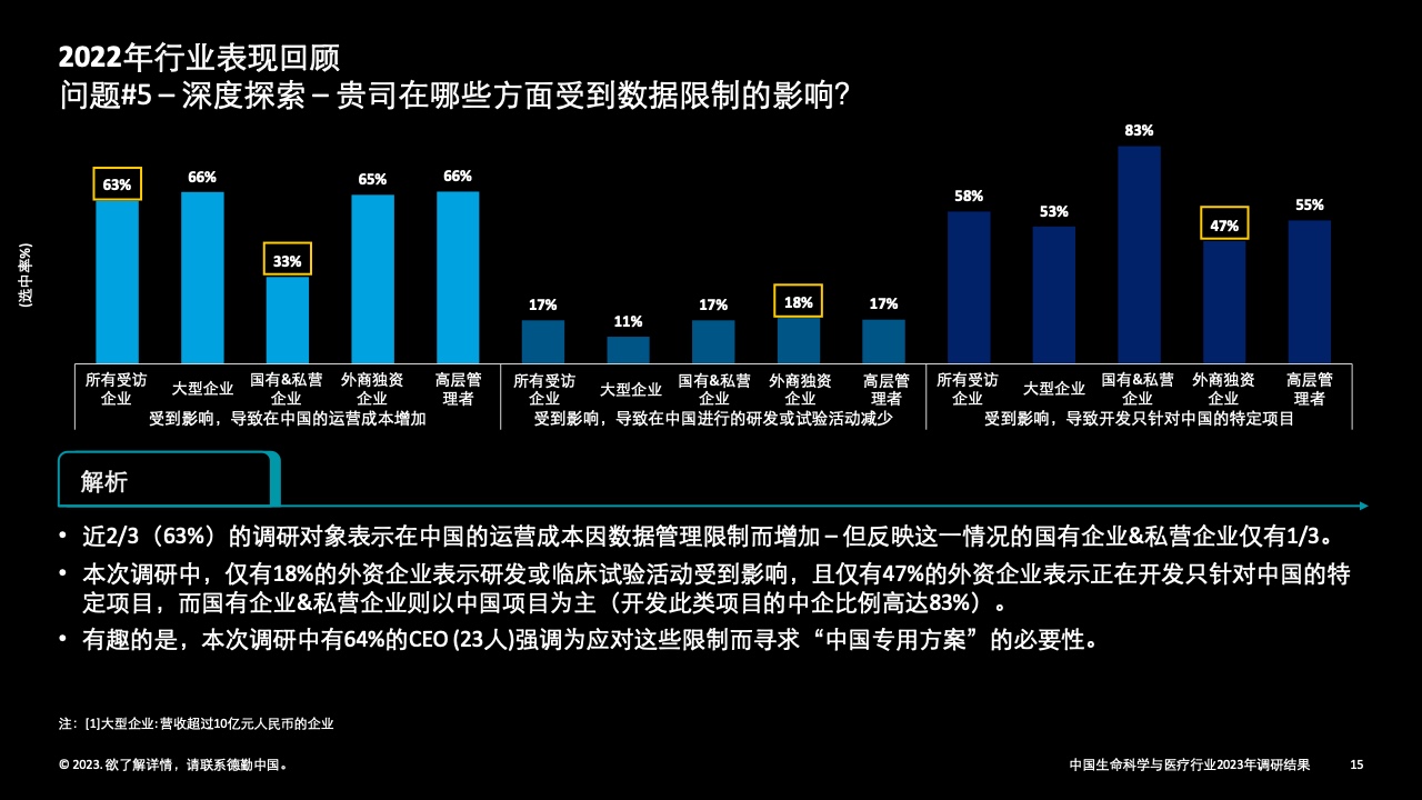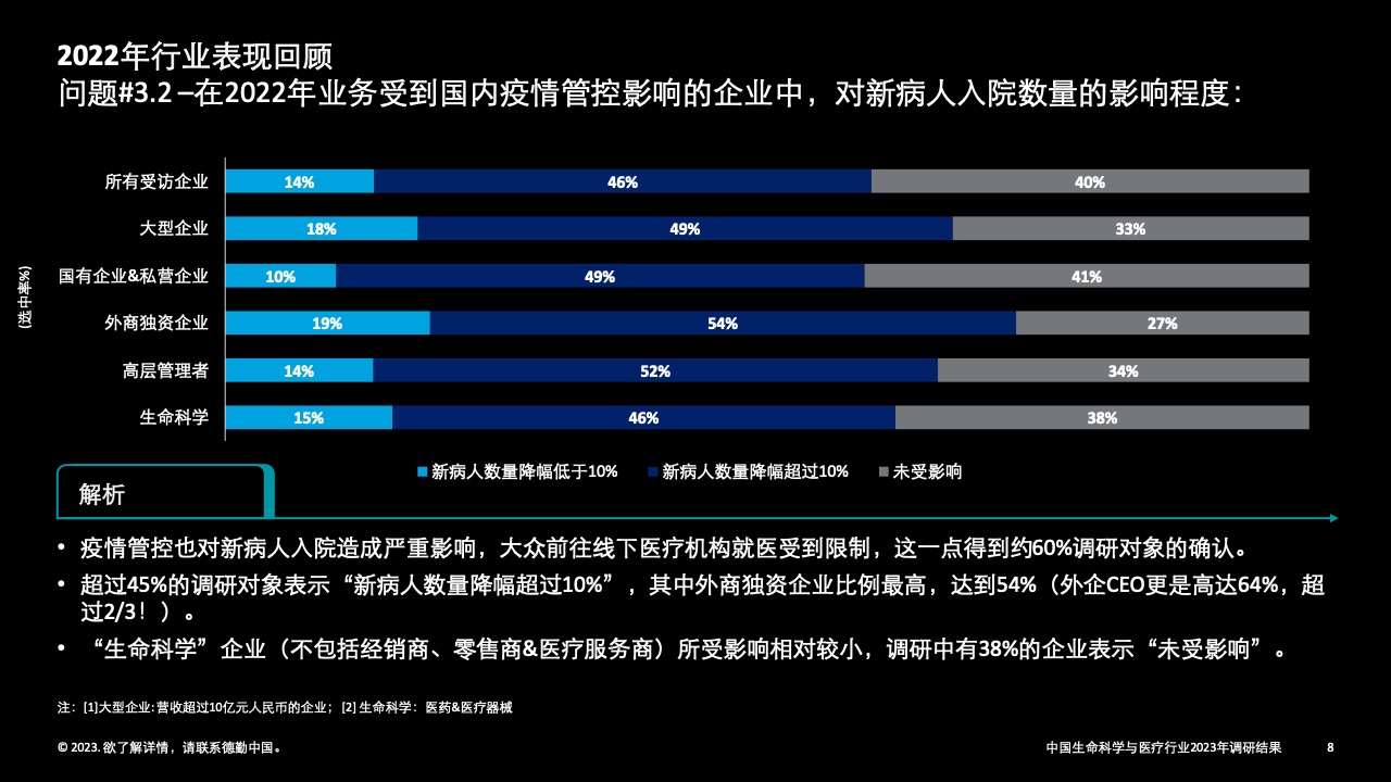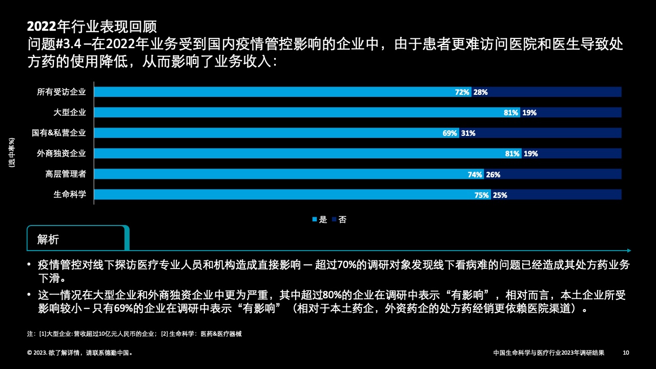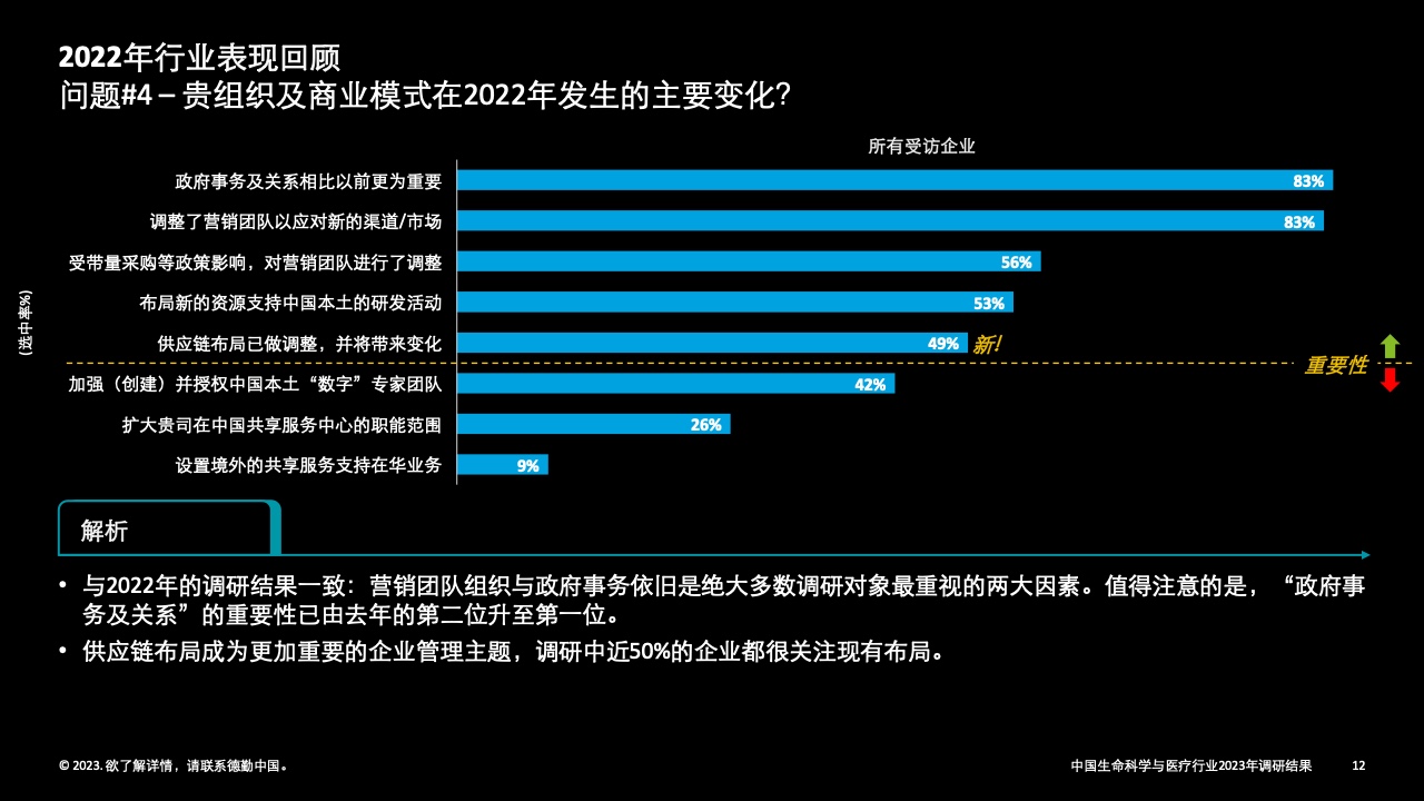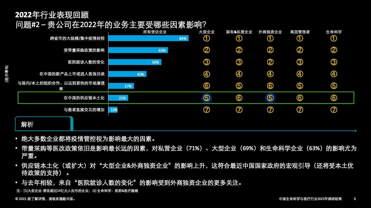 带量采购等医改政策依旧是影响最长远的因素,对私营企业(71%)、大型企业(69%)和生命科学企业(63%)的影响尤为严重。