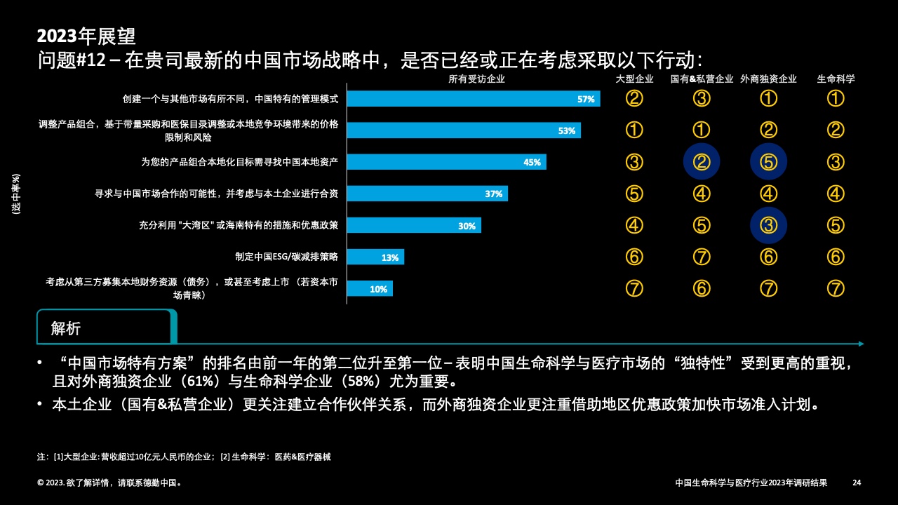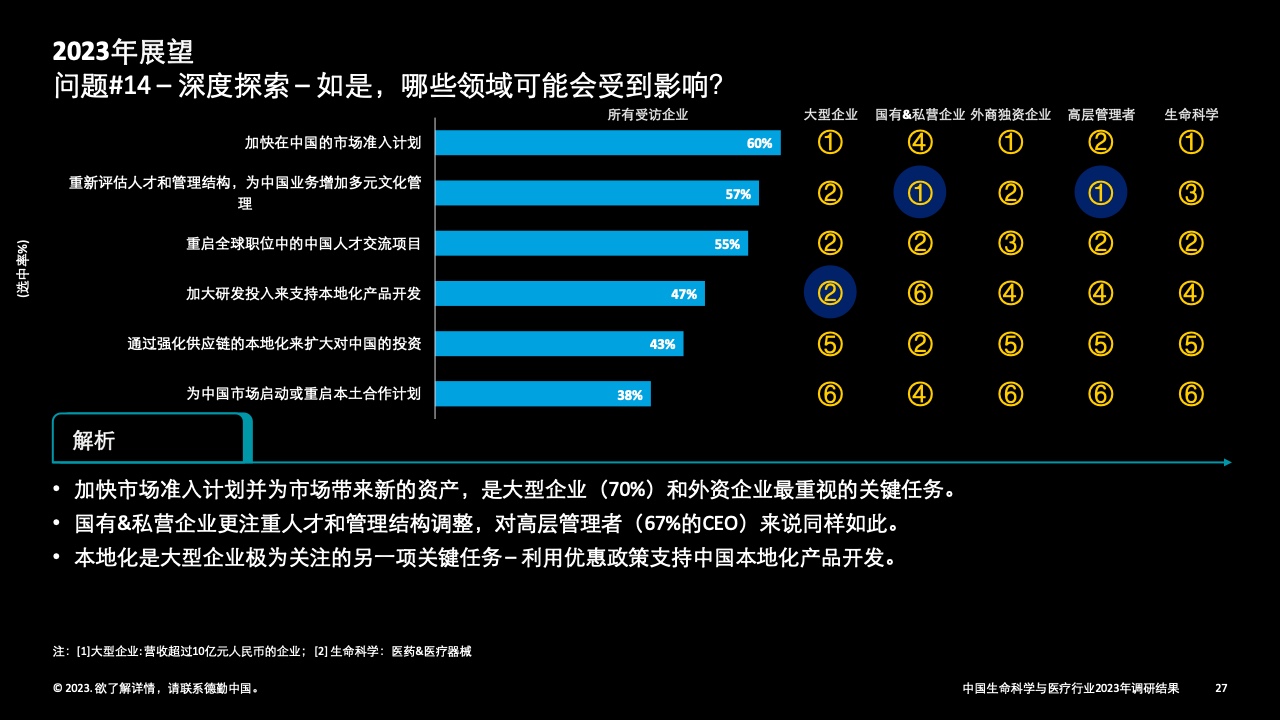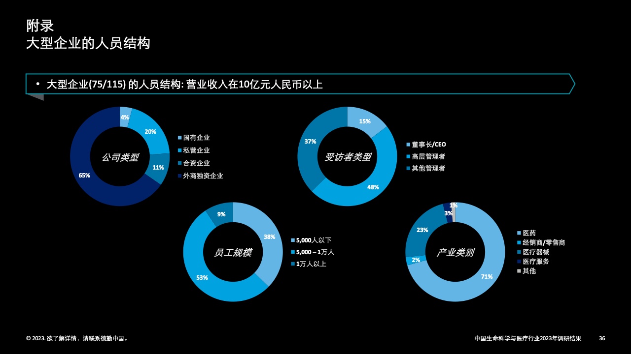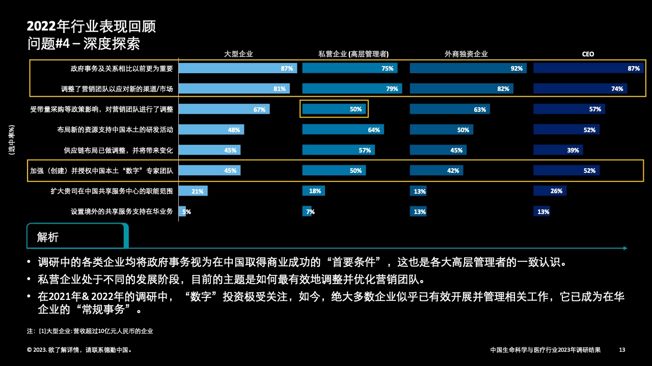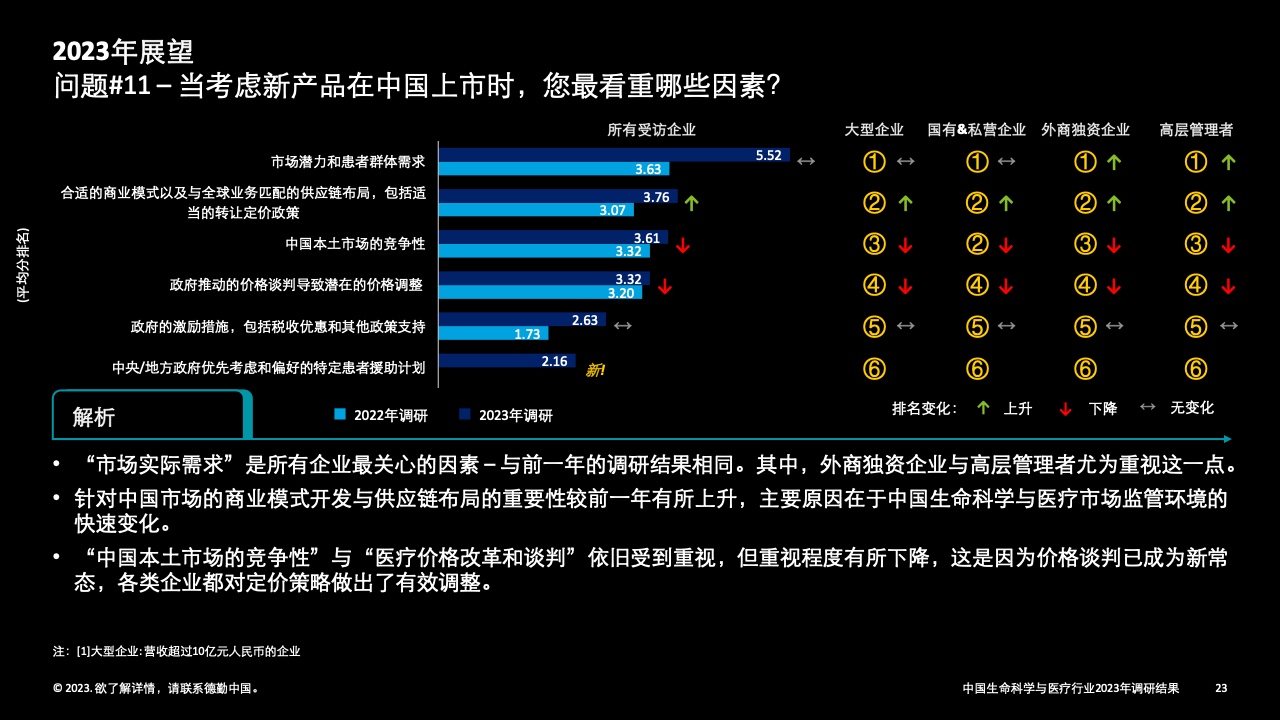 带量采购等医改政策依旧是影响最长远的因素,对私营企业(71%)、大型企业(69%)和生命科学企业(63%)的影响尤为严重。