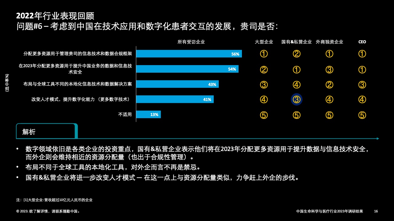 数字领域依旧是各类企业的投资重点,国有&私营企业表示他们将在2023年分配更多资源用于提升数据与信息技术安全,而外企则会维持相近的资源分配量(也出于合规性管理)。