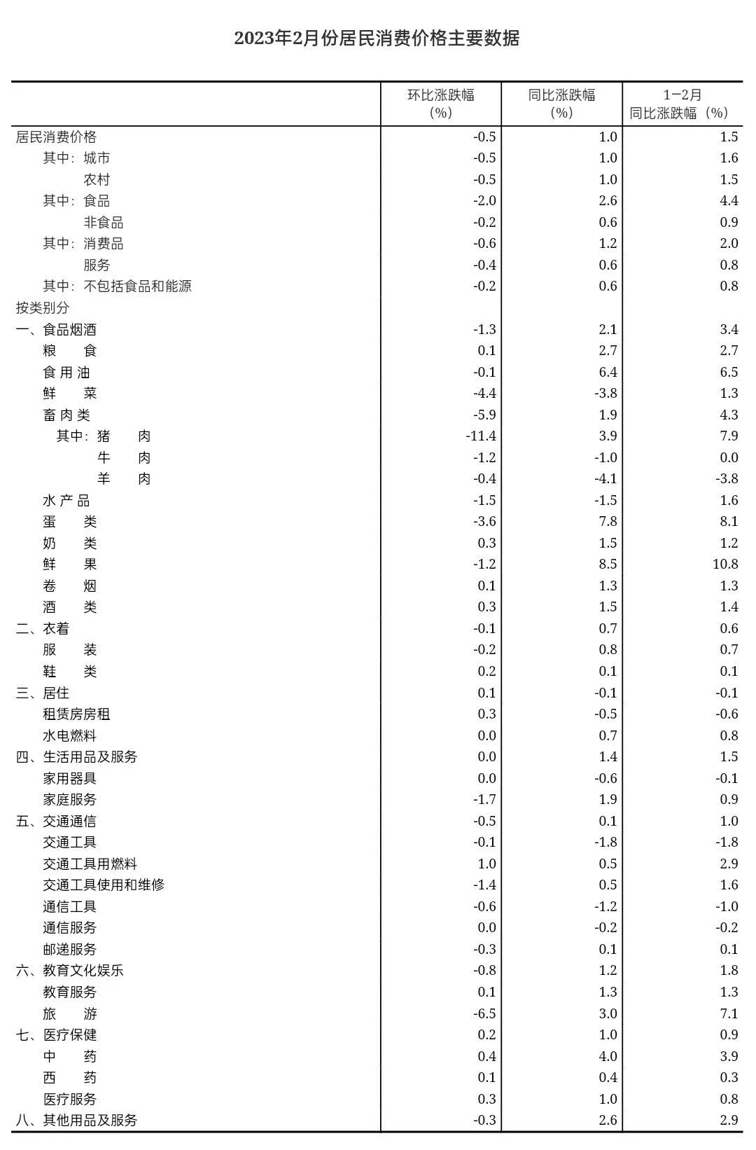2023年2月份,全国居民消费价格同比上涨1.0%。其中,城市上涨1.0%,农村上涨1.0%;食品价格上涨2.6%,非食品价格上涨0.6%;消费品价格上涨1.2%,服务价格上涨0.6%。1—2月平均,全国居民消费价格比上年同期上涨1.5%。