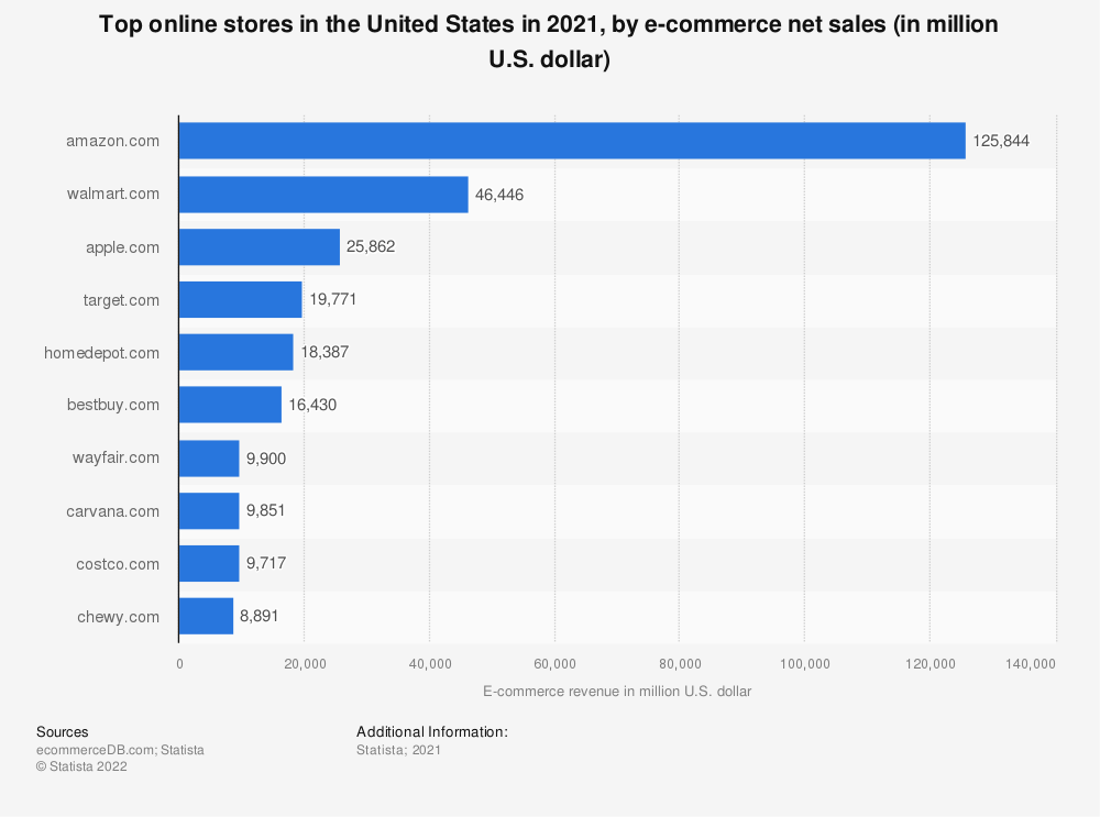 2021年美国最大的在线商店,按电子商务净销售额排序(单位:百万美元) 数据来源:Statista.com