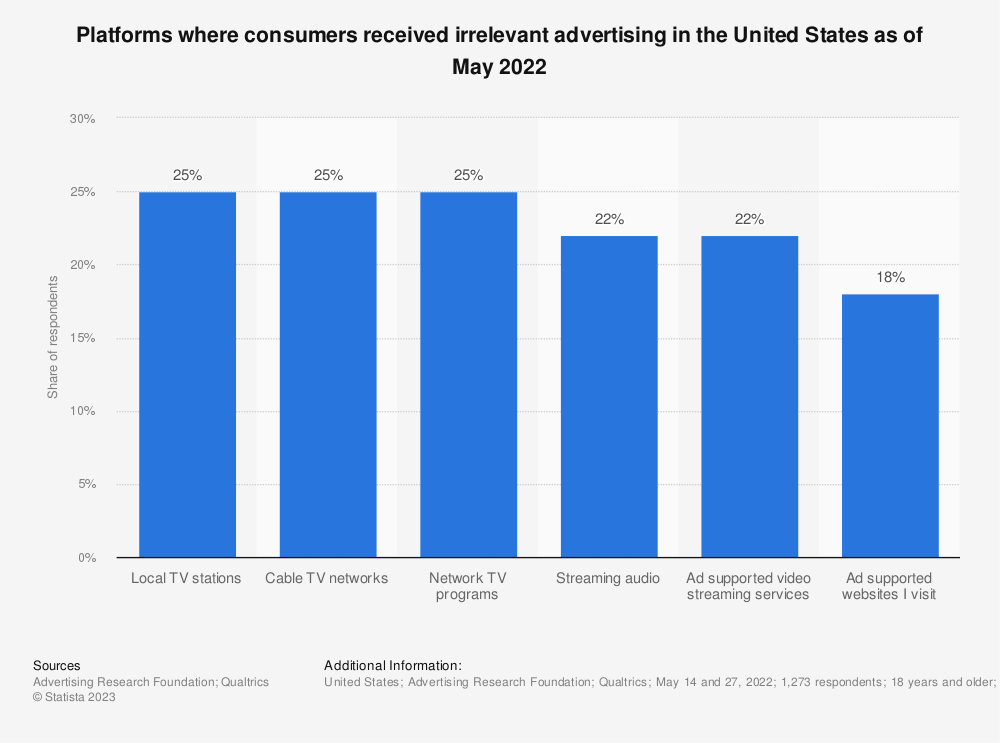 截至2022年5月,消费者在美国收到无关广告的平台 数据来源:Statista.com