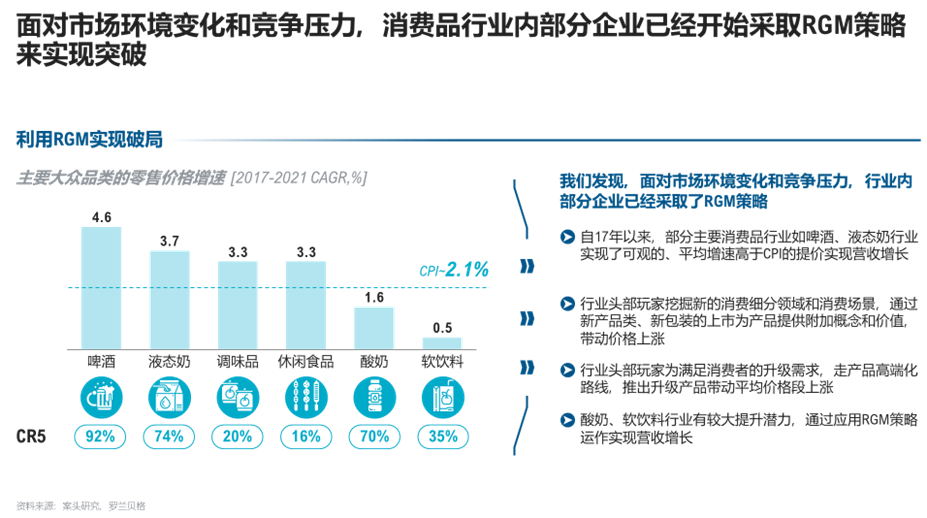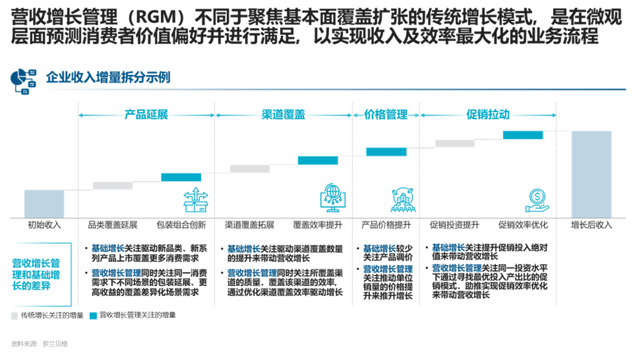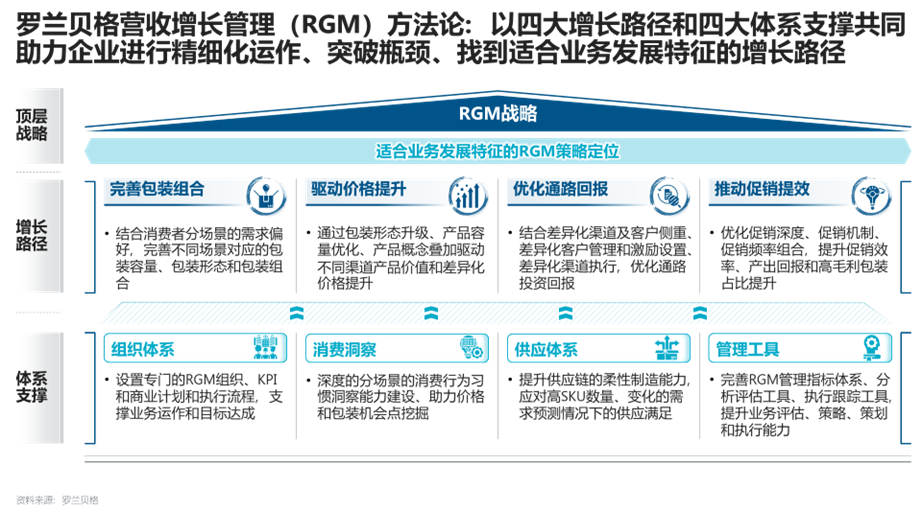 营收增长管理(RGM)为适配当前环境的重要手段:营收增长管理是通过应用有规律的分析方法、在微观层面识别消费者价值偏好、预测消费者行为,通过将购物者最有利的转化为购买者,以实现系统收入最大化的业务流程。其本质是通过了解消费者对产品在不同场景下的价值的认知,准确的细分场景化需求并配合精准铺货、差异化产品定价以满足消费者差异化需求、并获得更大收入和利润获得。这项业务流程与战略紧密相关、以发展目标为导向、且聚焦差异化价值供给带动的消费者价值获取提升。