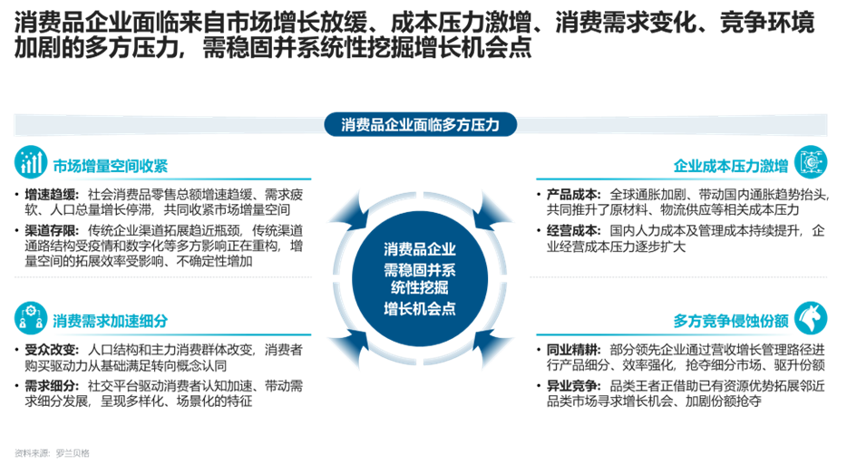 在市场增长放缓、成本压力激增、消费需求变化、竞争环境加剧的多方压力下,企业同时面临着营收增长瓶颈突显、利润下滑压力倍增、已有产品驱动减弱、多类竞争对手侵蚀份额的综合压力。在此背景下,企业需要思考如何进一步系统性的挖掘增长机会点、以及如何夯实自身行业地位和市场竞争力应对竞争。