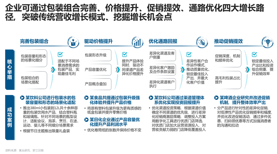 营收增长管理方法论包括完善包装组合、驱动价格提升、优化通路回报、推动促销提效四大营收增长路径,通过在产品、定价、通路、促销四个核心环节进行精细化运营,推动企业的增长效率提升、竞争力护城河构建,实现企业的持续性高效增长。