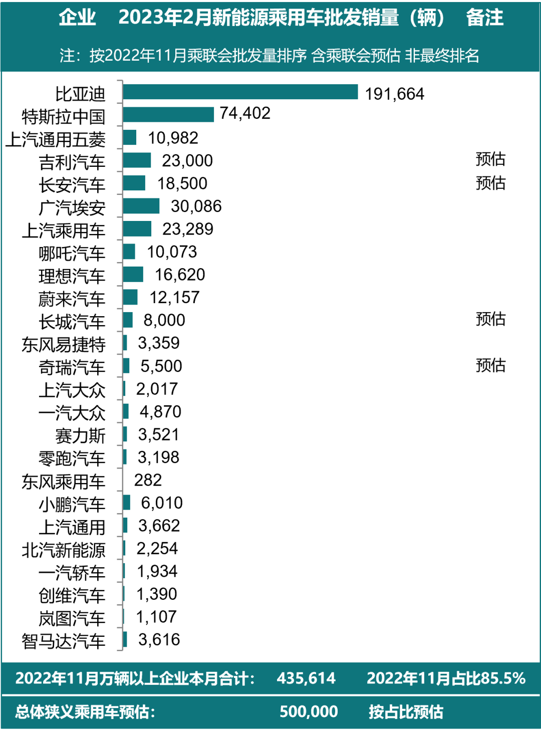 考虑到主力企业中的岁末年初产销波动较大,因此用22年11月主力企业销量占比测算。乘联会2022年11月全国乘用车市场新能源销量万辆以上的14家厂商批发销量占总体新能源乘用车全月销量的85.5%,这些企业的2月预估销量为43万辆,按照正常结构占比预测2月的全国新能源乘用车销量在50万辆,实现春节后开门红。