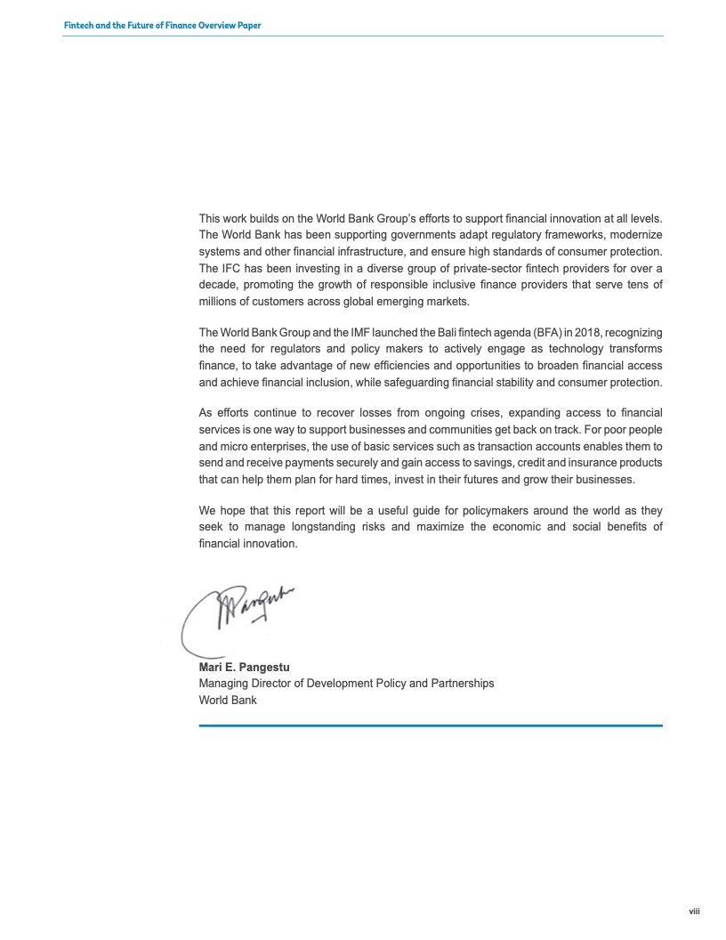 在《巴厘岛金融科技议程》的基础上,世界银行正在帮助政府调整法律、监管和监督框架,促进达成金融基础设施和支付系统的现代化,并确保高标准的消费者和投资者保护。政策制定者必须确保监督和监管框架与创新、包容、竞争、诚信和稳定的政策目标保持一致,重点是消费者保护。如果想到达这样的效果,必须让金融科技和金融服务促进韧性和包容性发展,我们应当鼓励创新和管控风险之间找到适当的平衡点。