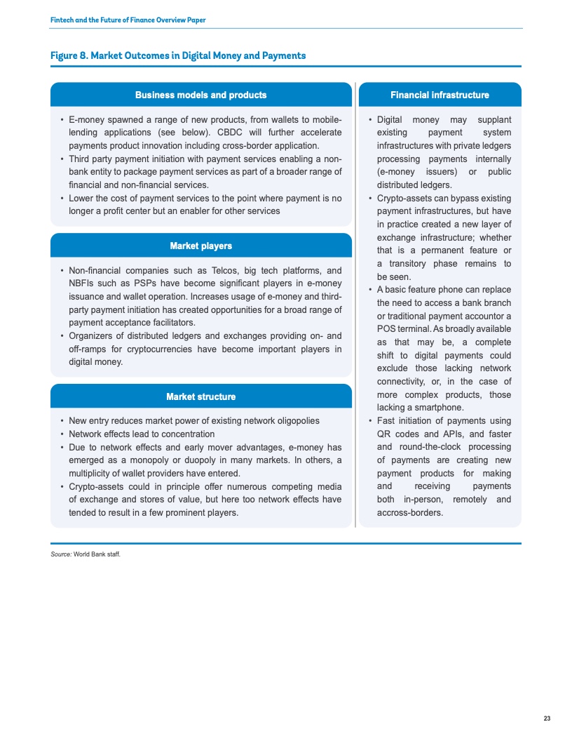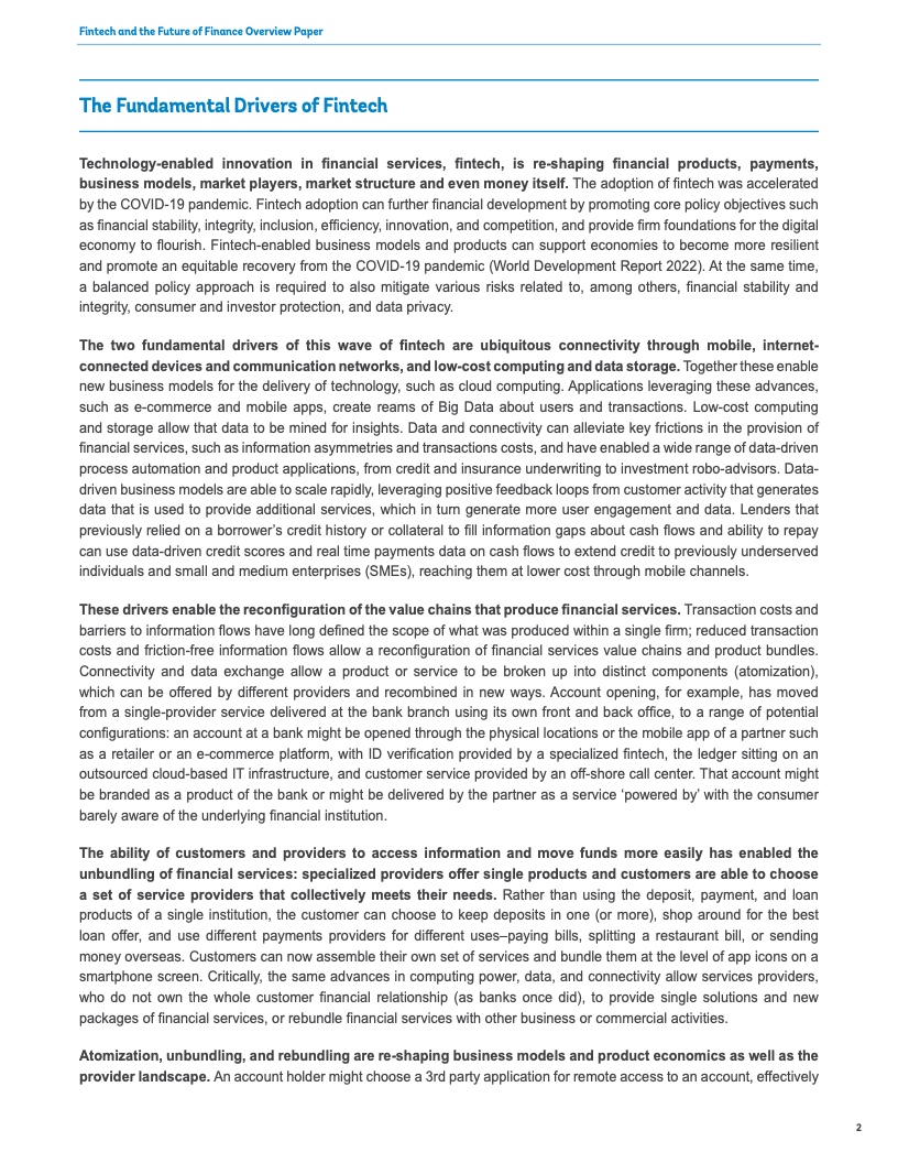 世界各地的政策制定者都在积极拥抱金融科技的发展,以促进数字经济的创新和增长。在新冠疫情期间,政府和企业依靠技术,特别是移动货币和电子支付来维持金融服务和商业活动。例如,在全世界许多地方,电子商务和社交媒体平台使小型零售商得以在线销售,使他们得以在前所未有的流动性限制下维持运营。