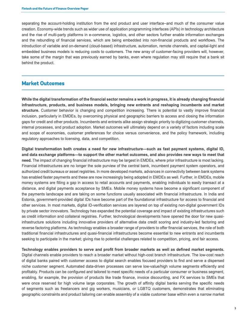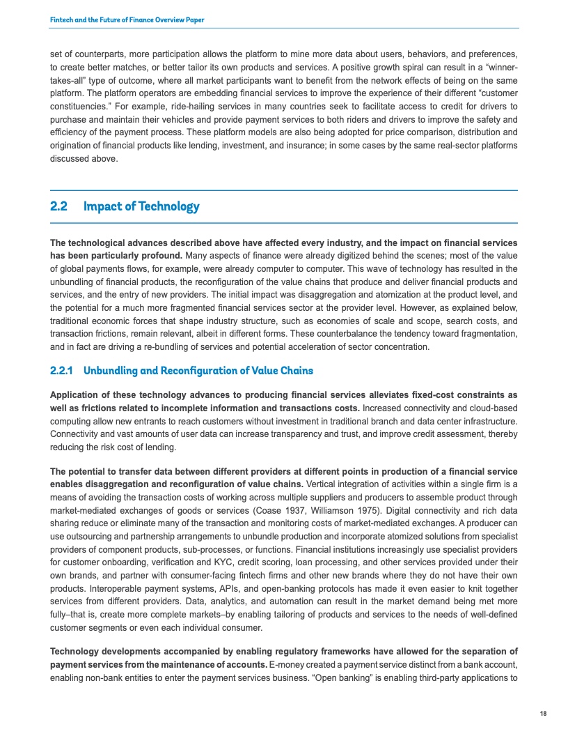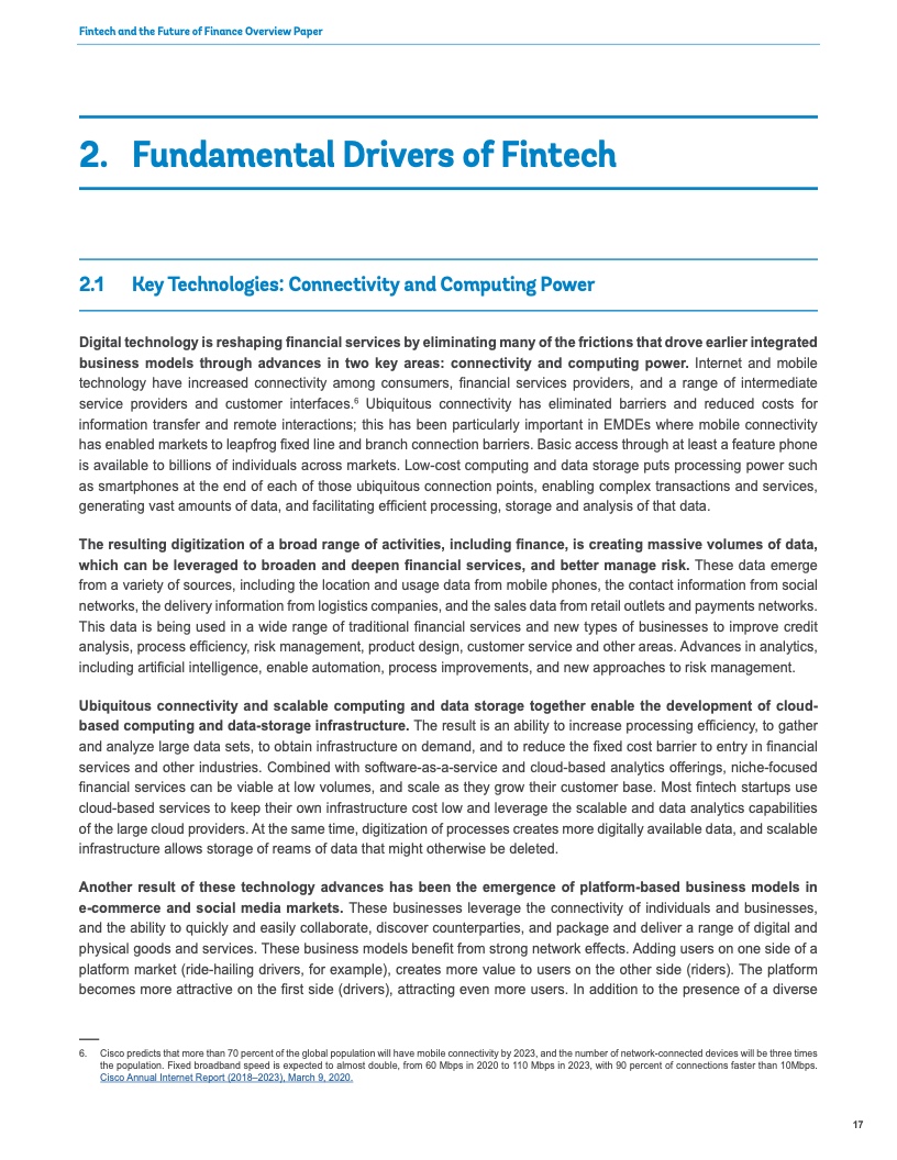 这种成本降低之所以成为可能,是由于金融科技借助克服地理、物理和社会障碍以及让信息更广泛地提供给消费者和供应商来进一步提升全球金融体系的效率。即使在偏远的农村地区,为贫困人口和小企业服务的成本也大幅下降。