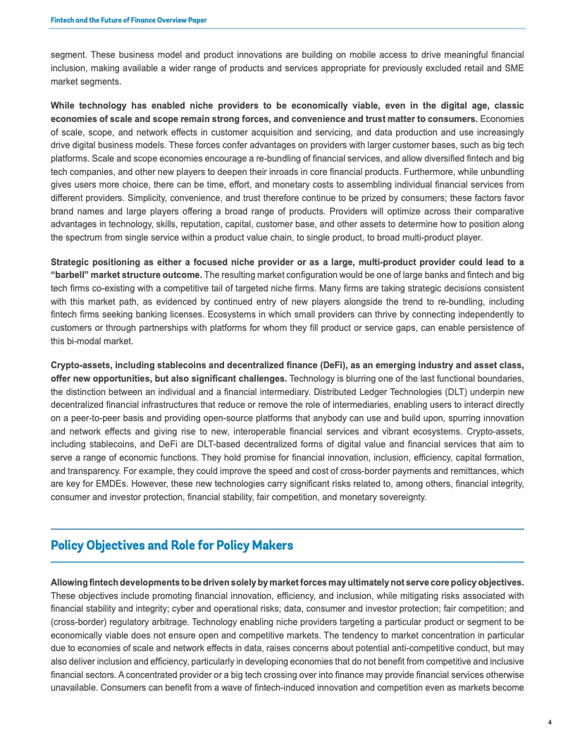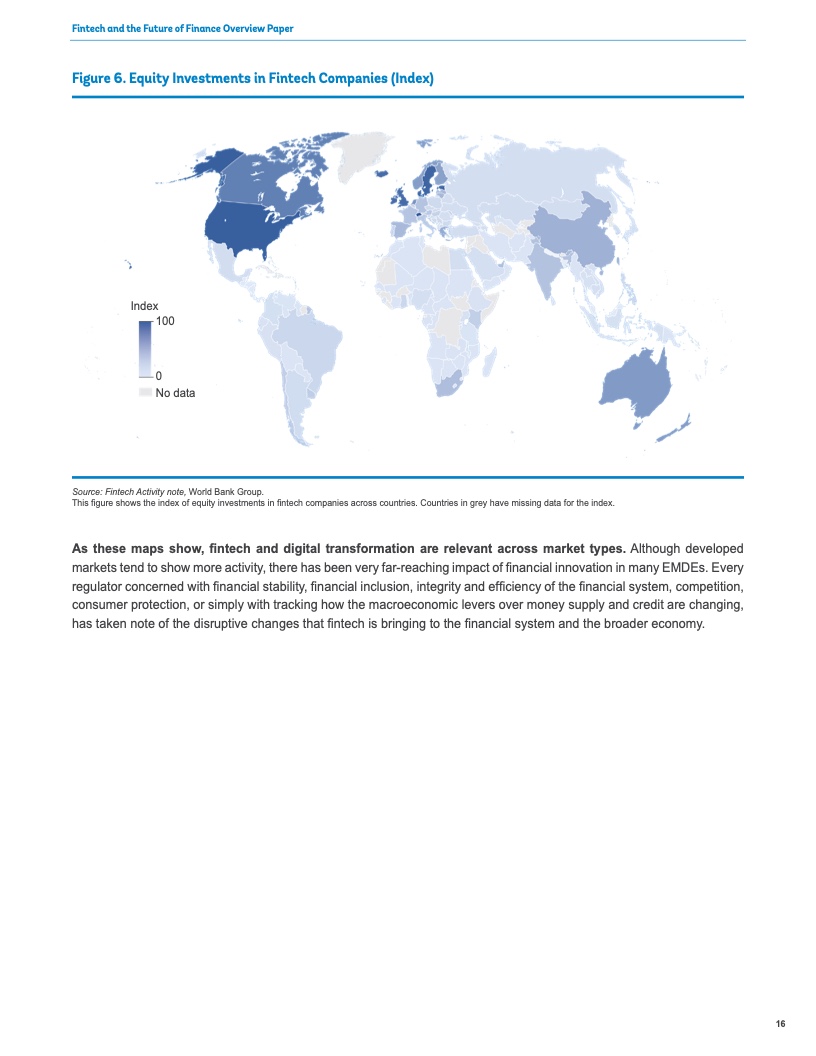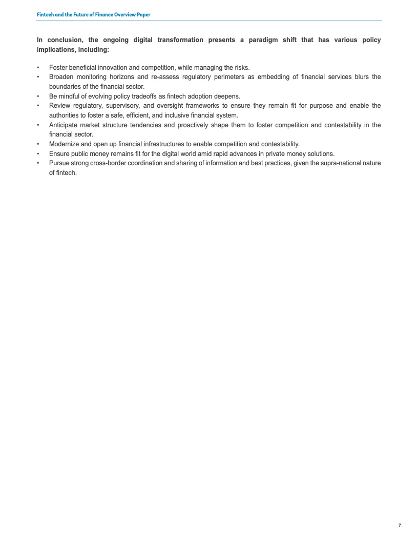如果监管者和监督者不从根本上改变他们监督金融体系的方式,那么技术和新商业模式带来的不断上升的风险可能会掩盖金融科技带来的收益。他们应当采取一种监管方法,更多地关注风险和服务类型,而不是相关机构类型。“相同风险,相同活动,相同监管”是金融监管机构的座右铭。在新兴市场和发展中经济体,监管者和监督者应当改进监测工具并校准受监管公司的边界。他们需要一个结构化的框架来识别足以危及金融系统健康的金融科技公司,并制定应对可能失败的预案。
