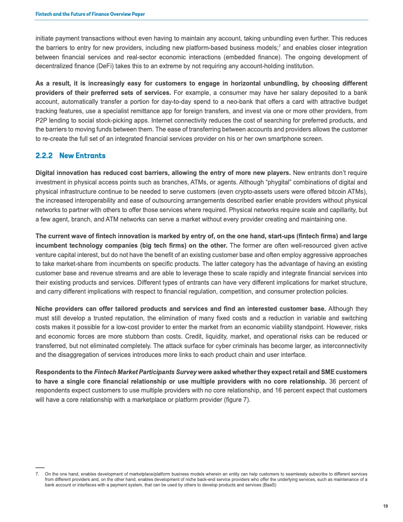 技术和连通性使新参与者得以拆分金融产品和服务,并与传统银行、贷款机构和保险公司竞争。例如,电信公司正在迅速扩展支付服务。电子商务平台向借助其平台销售的商家提供贷款。初创公司提供软件和监管合规服务,使几乎任何行业的任何企业都能为客户提供信用卡和交易账户。支付、贷款和保险产品被嵌入到其他产品和服务中——从搜索引擎到社交媒体平台,从购物网站到制造业的B2B电子商务平台。
