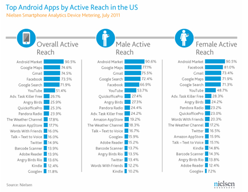 调查机构尼尔森今天公布了最新手机的Android智能机使用习惯数据,统计数据显示,男性用户似乎对手机中的地图情有独钟,使用率明显较高,而女性则更喜欢用Facebook应用进行社交活动。这一数据是从30天内前20个排名的Android应用被调用频率来统计出的。