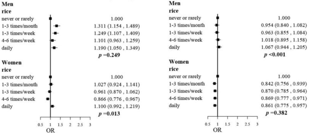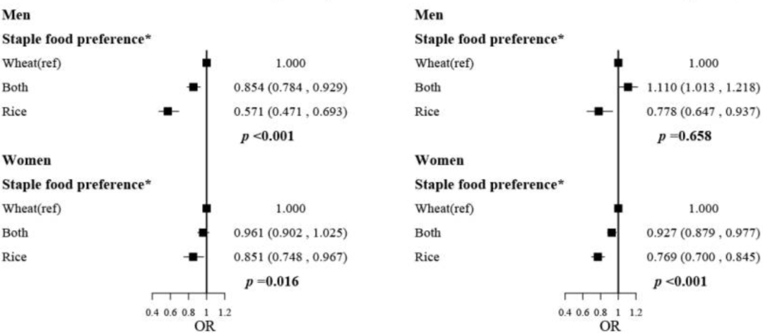 数据显示,在这部分BMI正常的参与者中,每天都吃面食的男性出现全身肥胖风险是<1次/周的2.25倍!此外,与面食爱好者相比,爱吃米饭的男性出现全身及中心性肥胖的风险分别降低42.9%和22.2%,女性分别降低14.9%和23.1%。