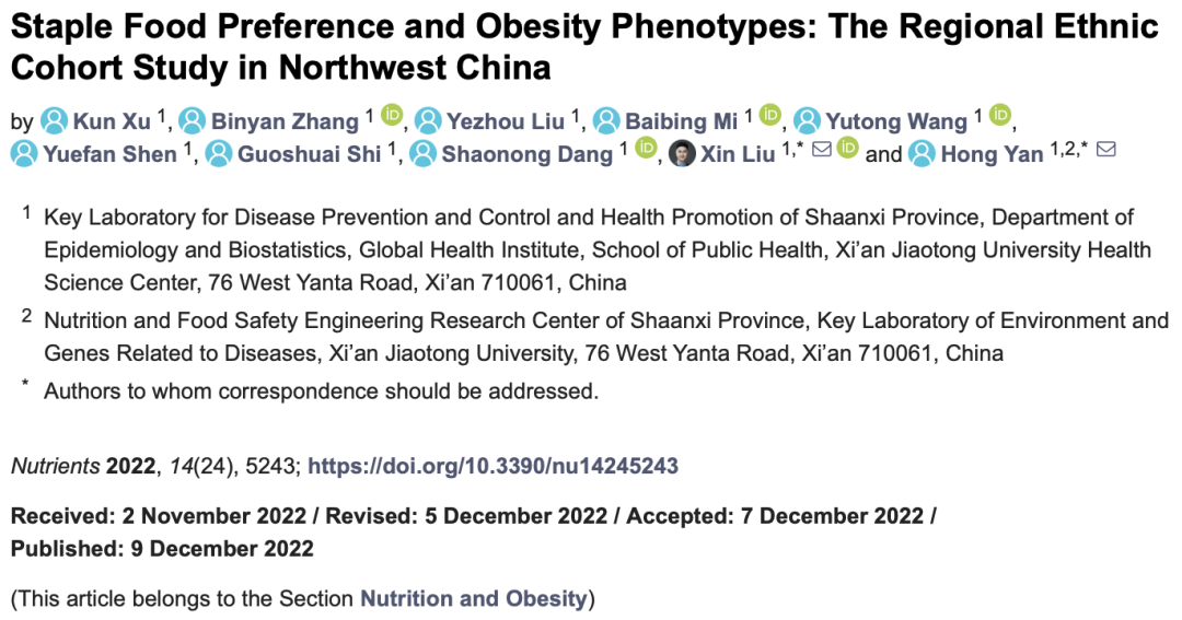 Xu K, Zhang B, Liu Y, Mi B, Wang Y, Shen Y, Shi G, Dang S, Liu X, Yan H. Staple Food Preference and Obesity Phenotypes: The Regional Ethnic Cohort Study in Northwest China. Nutrients. 2022; 14(24):5243. https://doi.org/10.3390/nu14245243