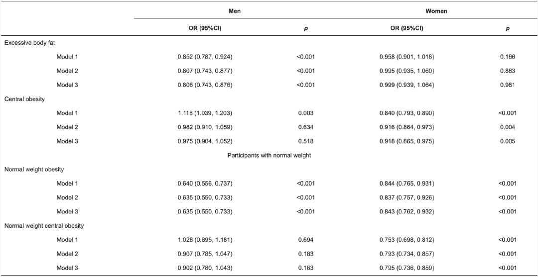 此外,在BMI正常(18.5-24.9kg/m2)的群体中,更爱吃面食与更高的全身及中心性肥胖风险之间的关联性更为强烈。